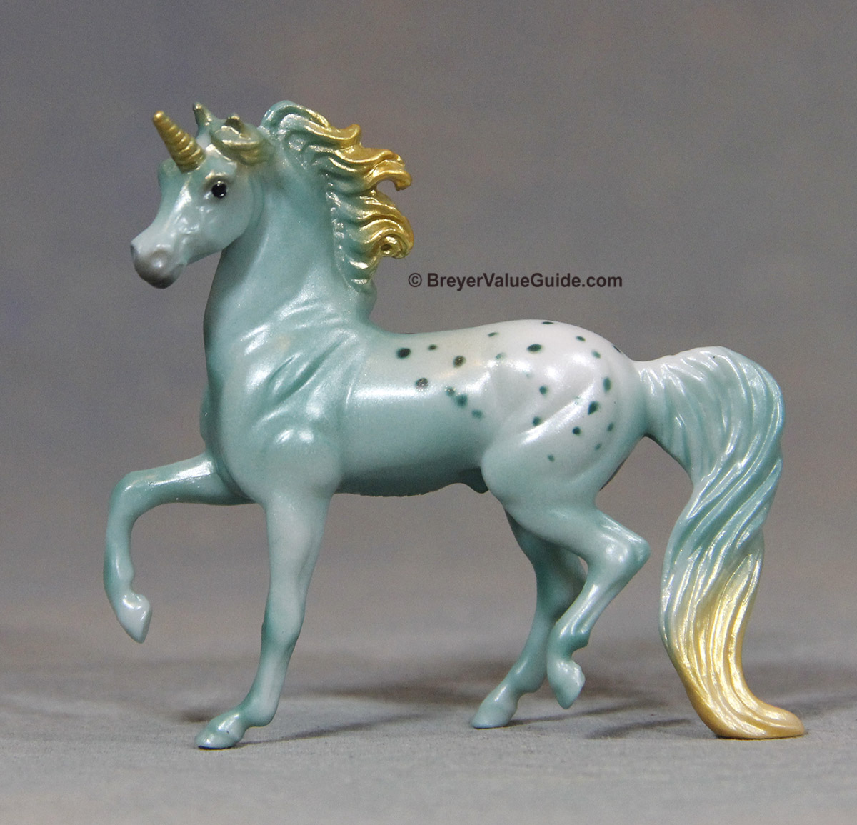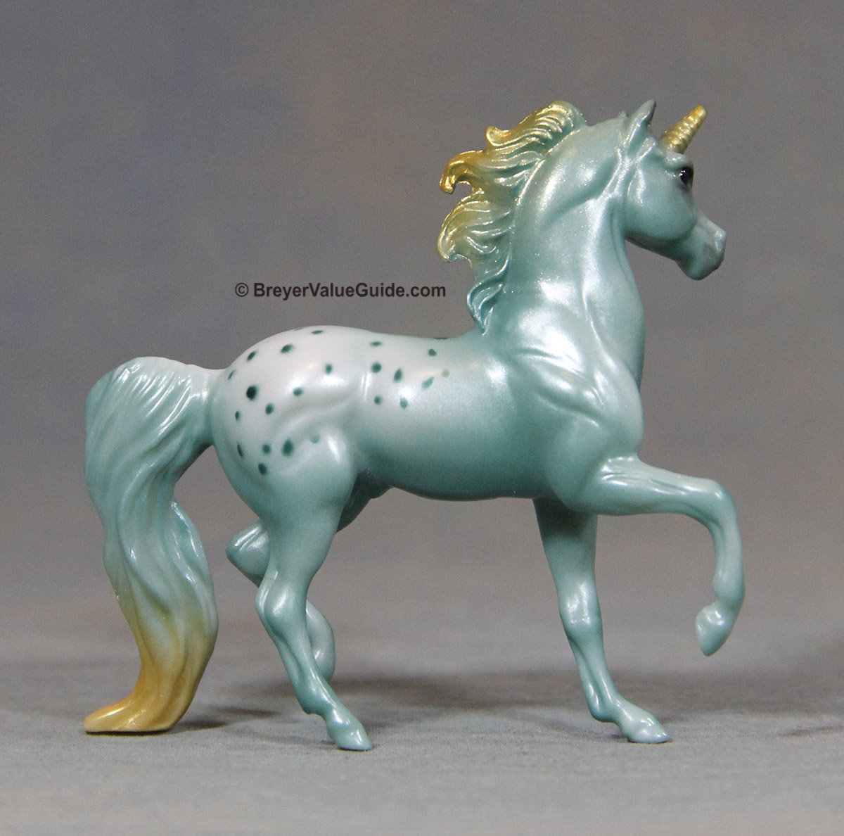 Iridescent green appaloosa, gold highlights in mane and tail, gold horn – with Warmblood and Standing Foal Issue price: $11 set