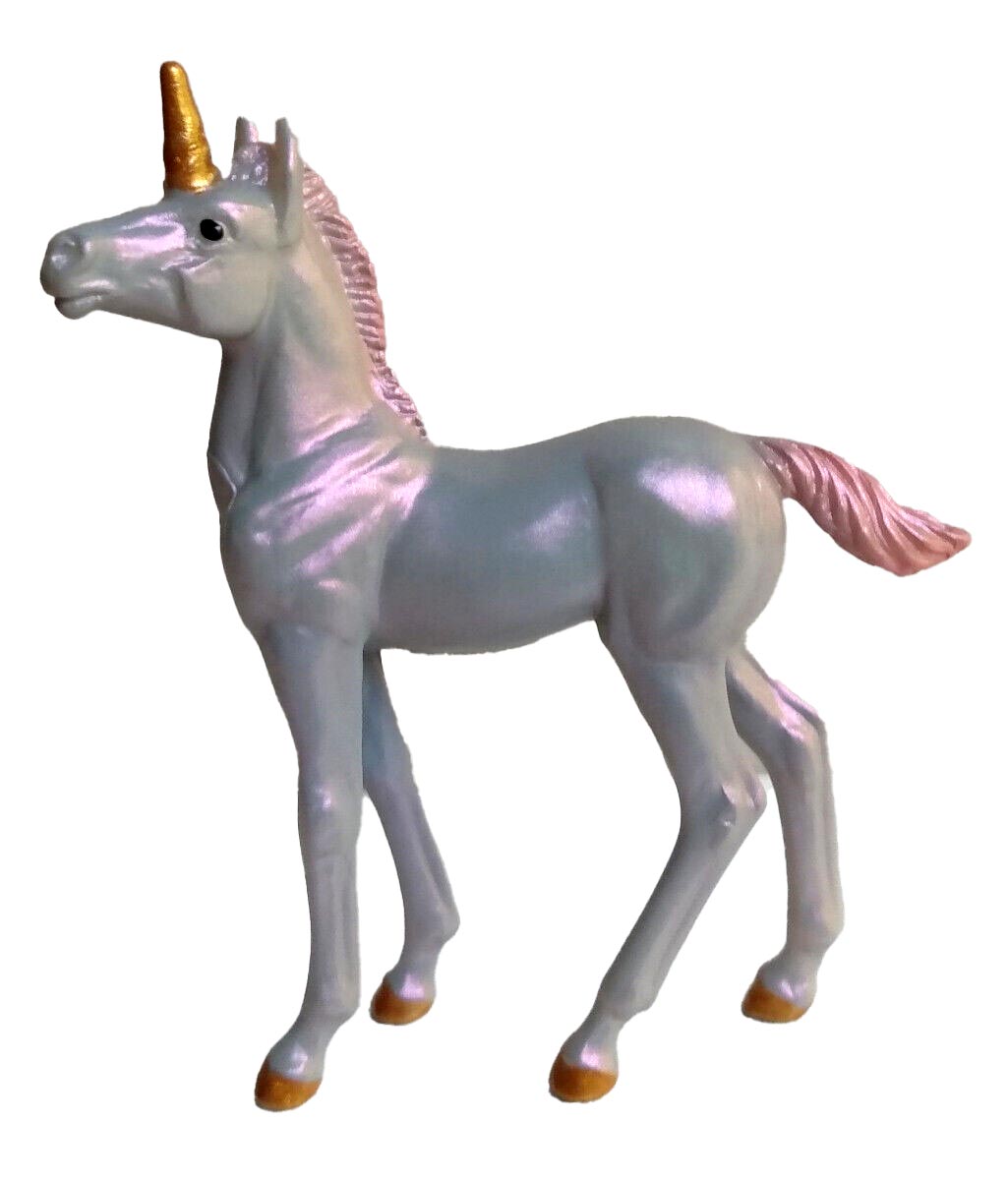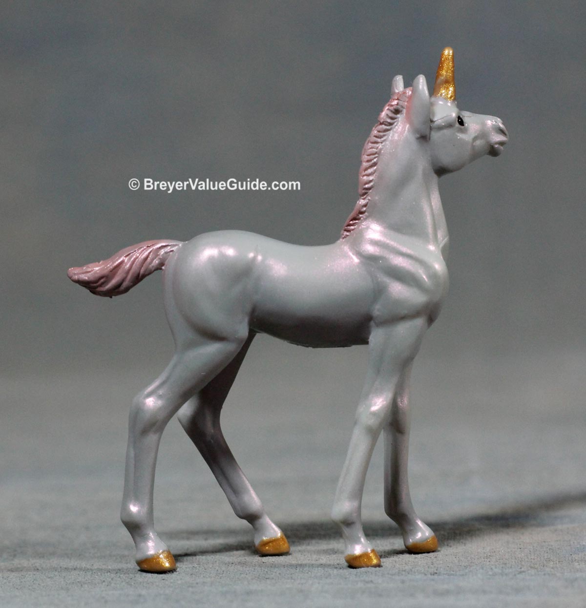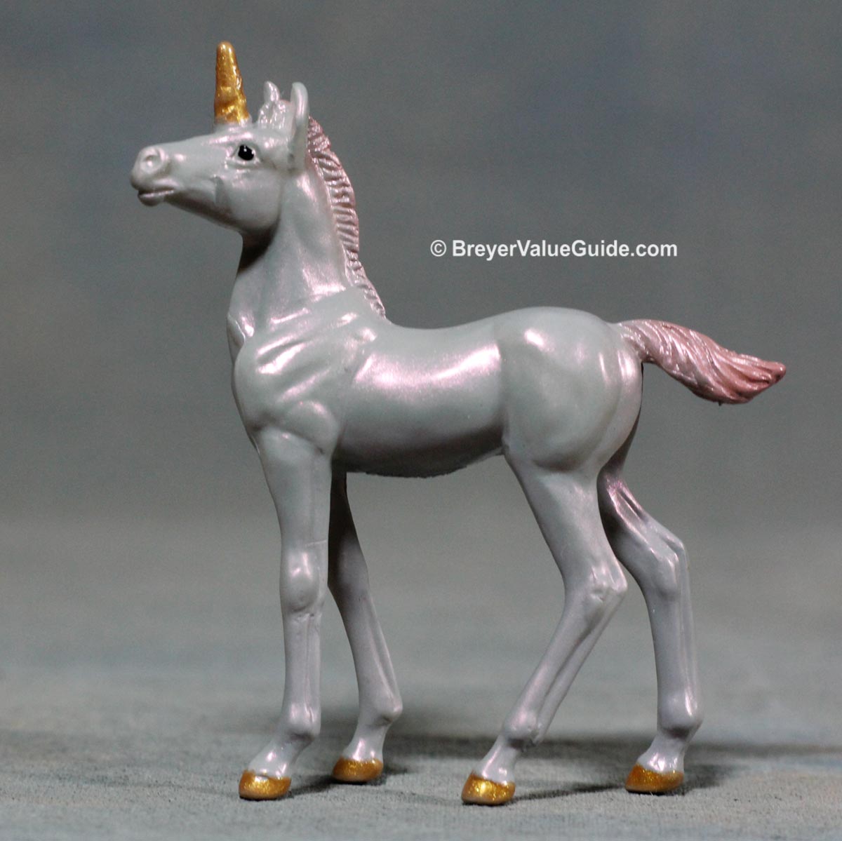 Iridescent/colorshifting white, pink mane and tail, gold horn and hooves, initially released by Tractor Supply – with Haflinger Stallion/Kit and Prince Charming Issue price: $13 set
