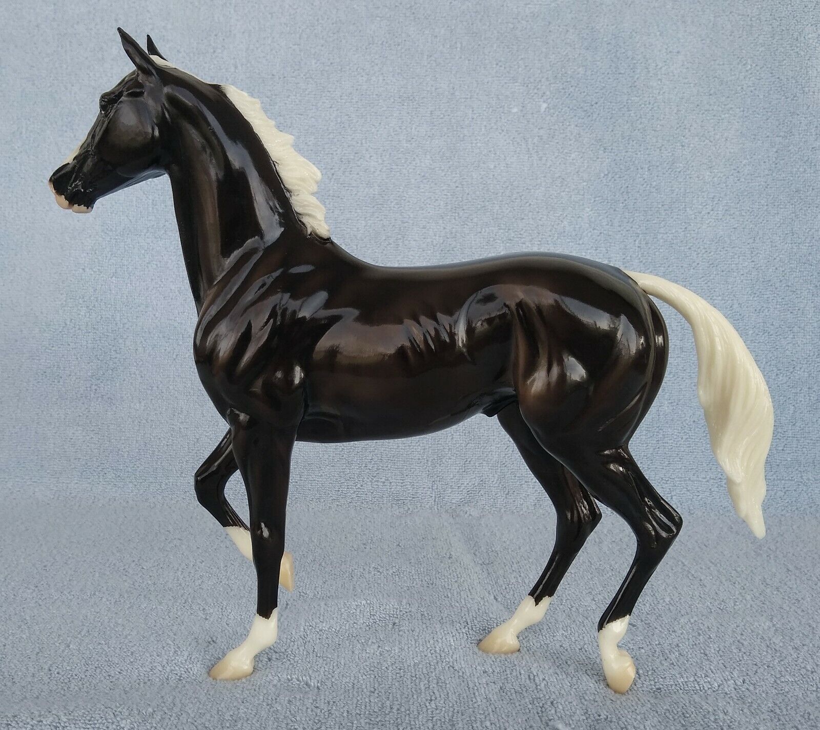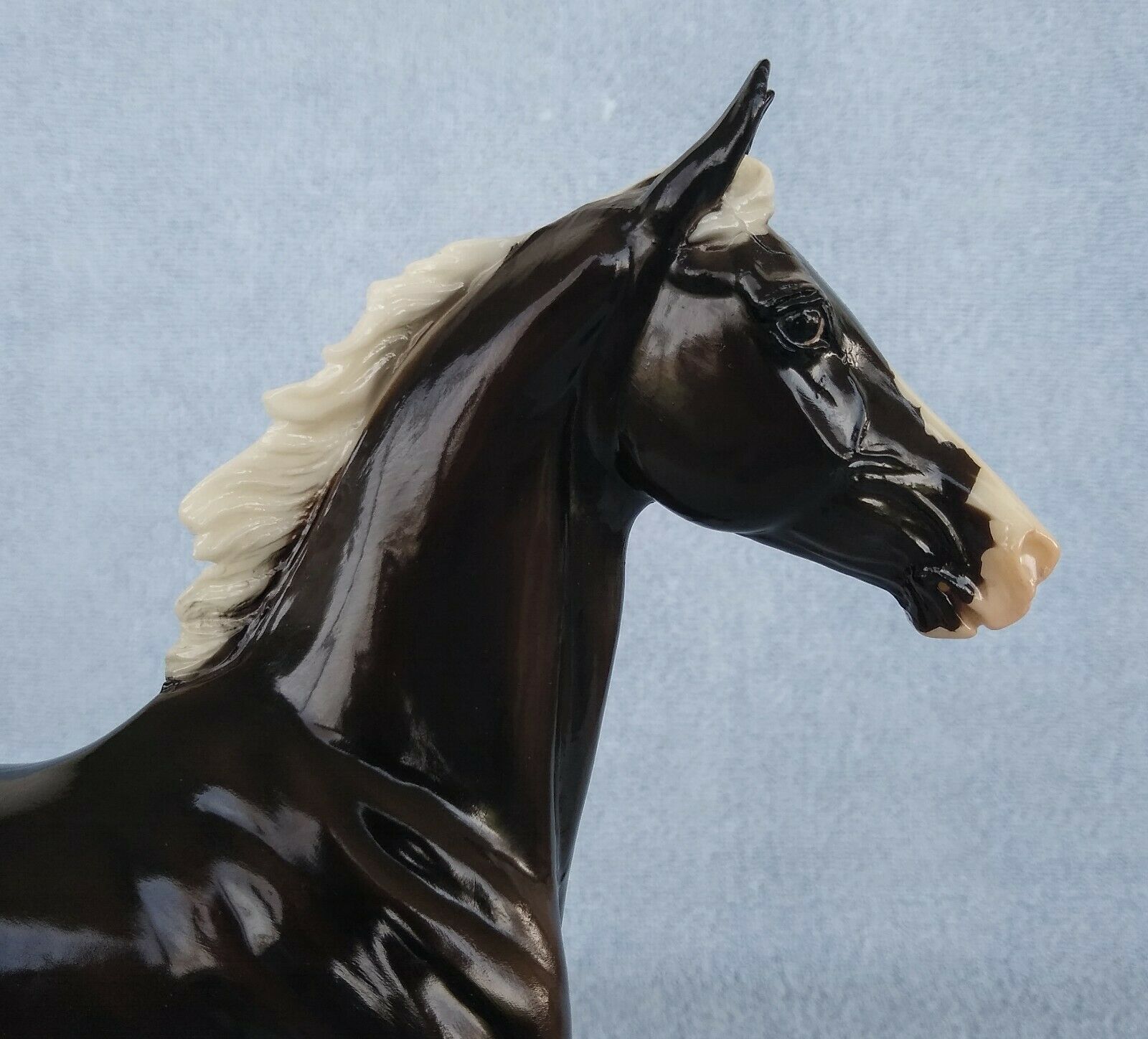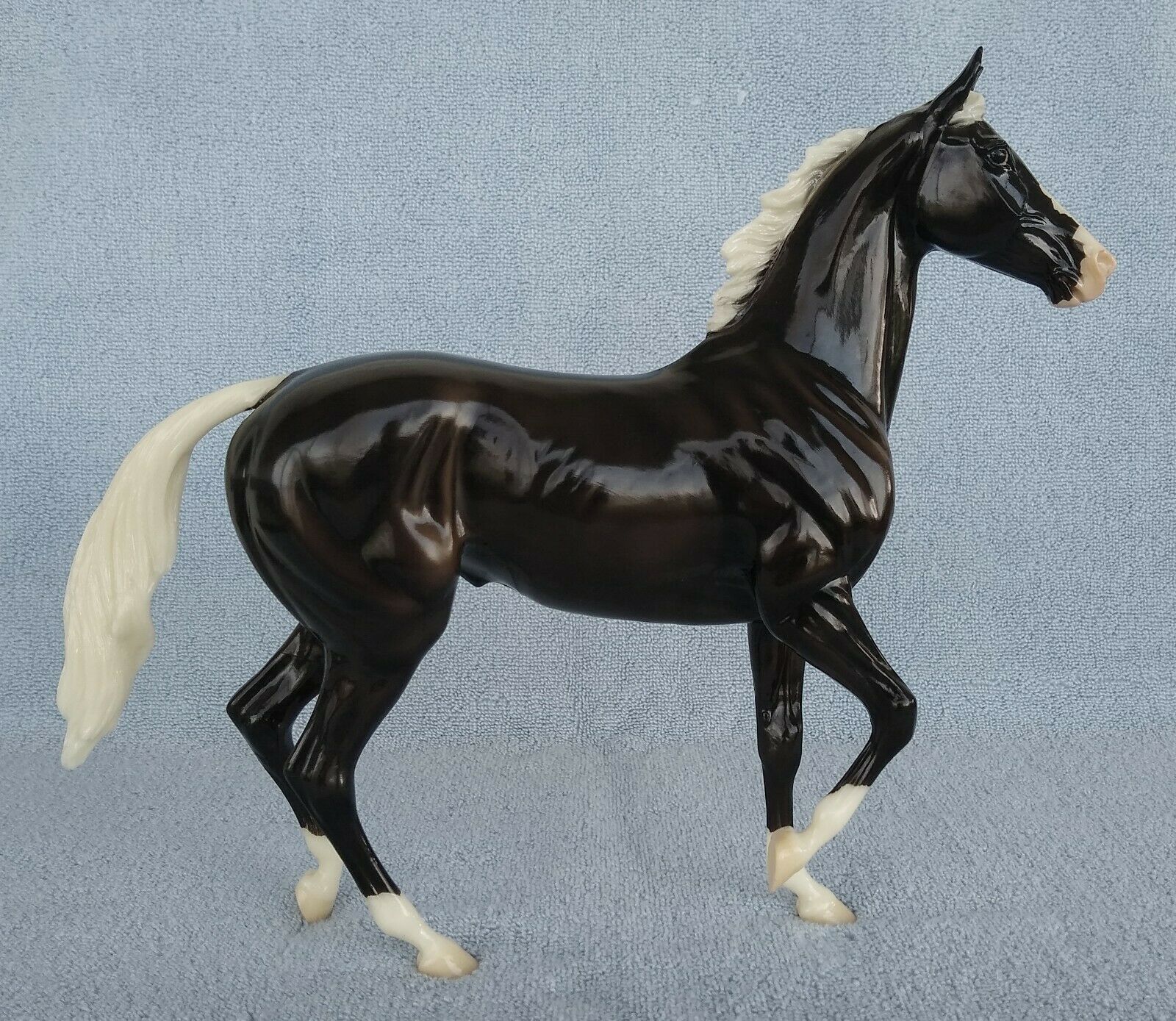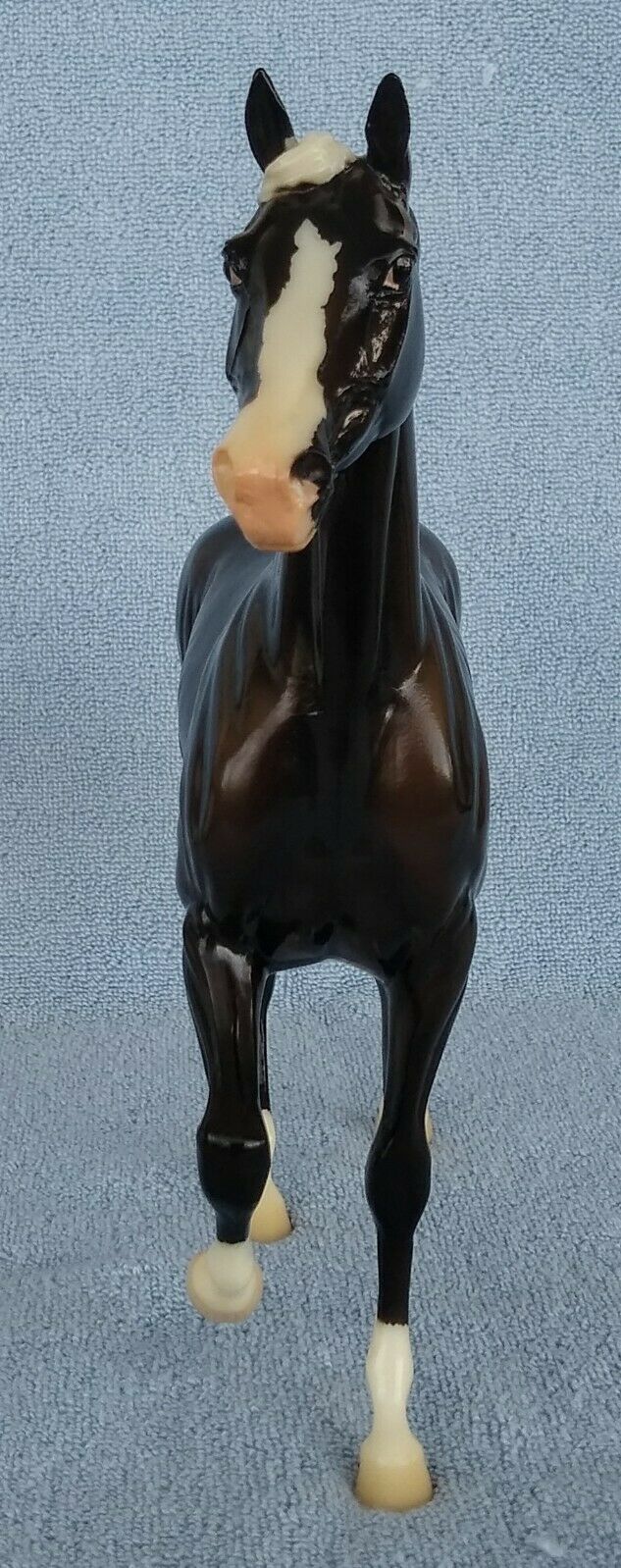 Glossy charcoal; chocolate undertones; stenciled bald face; white mane and tail; 4 socks; BreyerFest Volunteer SR; 1/80