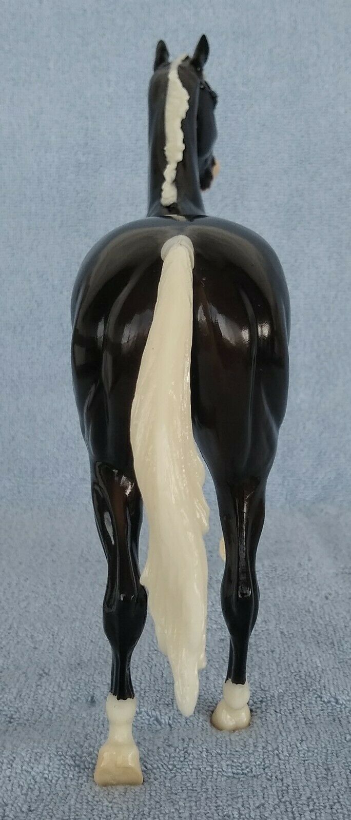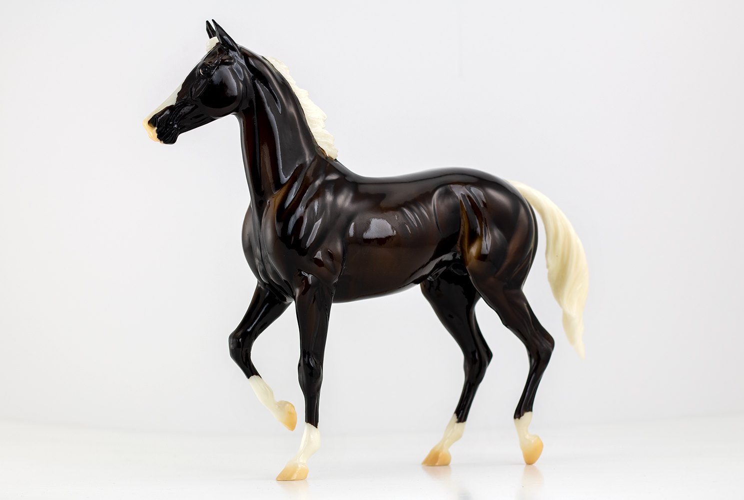 Glossy charcoal; chocolate undertones; stenciled bald face; white mane and tail; 4 socks; BreyerFest Volunteer SR; 1/80