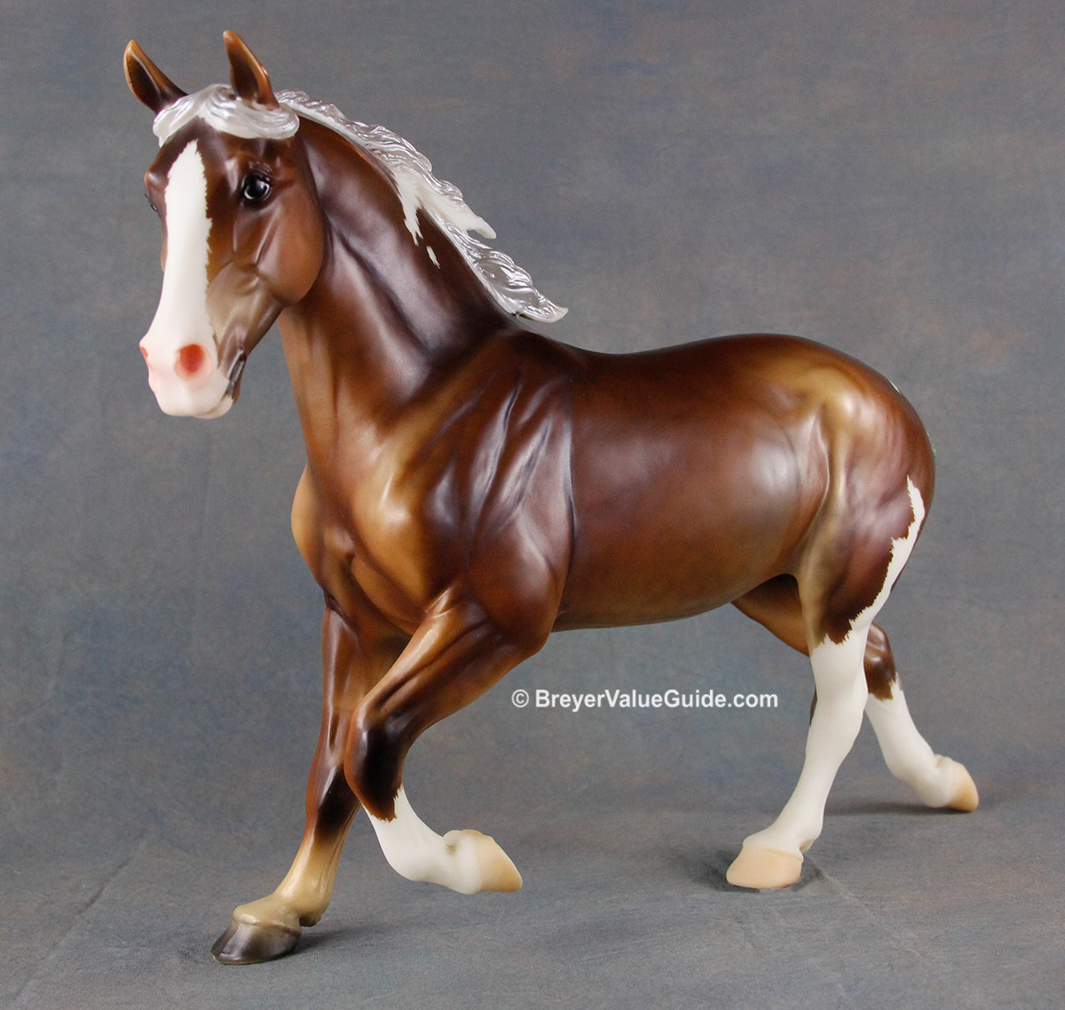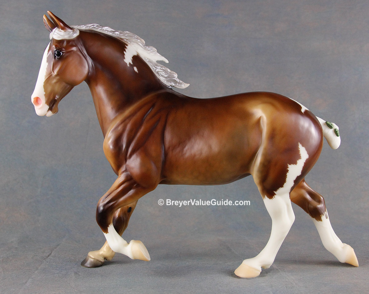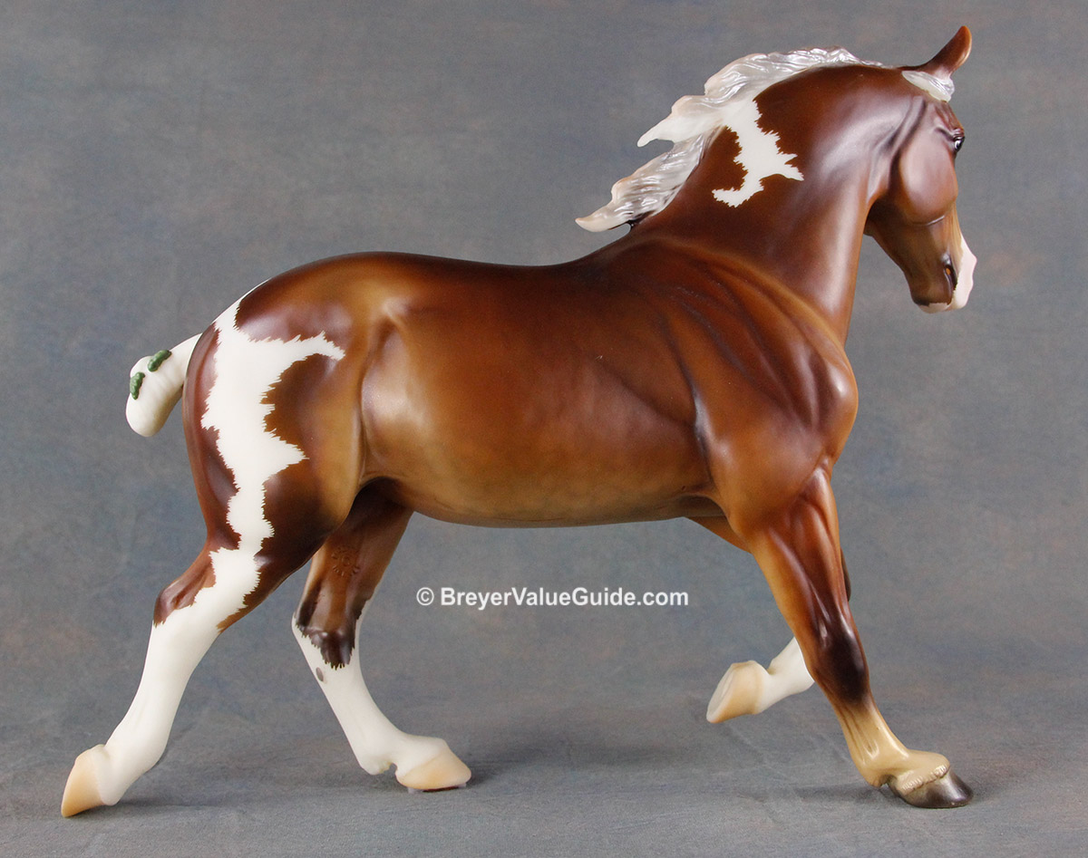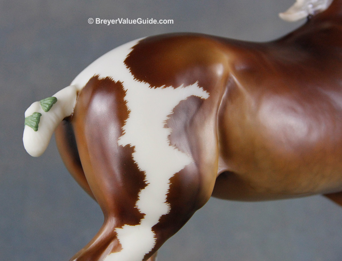 Matte silver bay pinto; minimal white; apron face; dapples; 3 stockings; green tail ribbon; BreyerFest Volunteer SR; 1/120