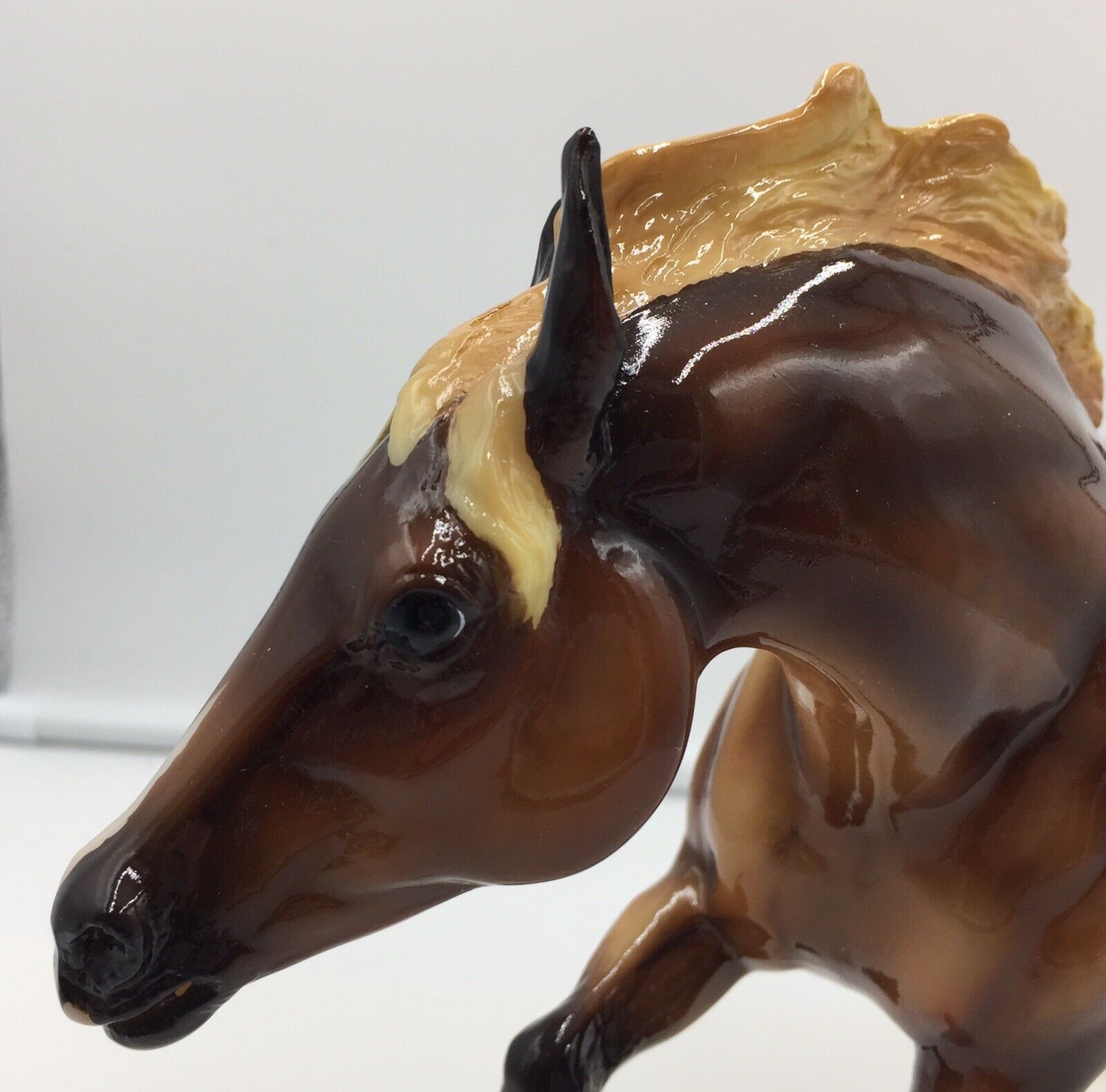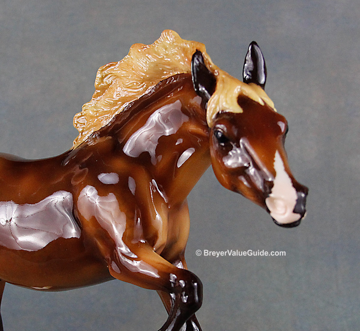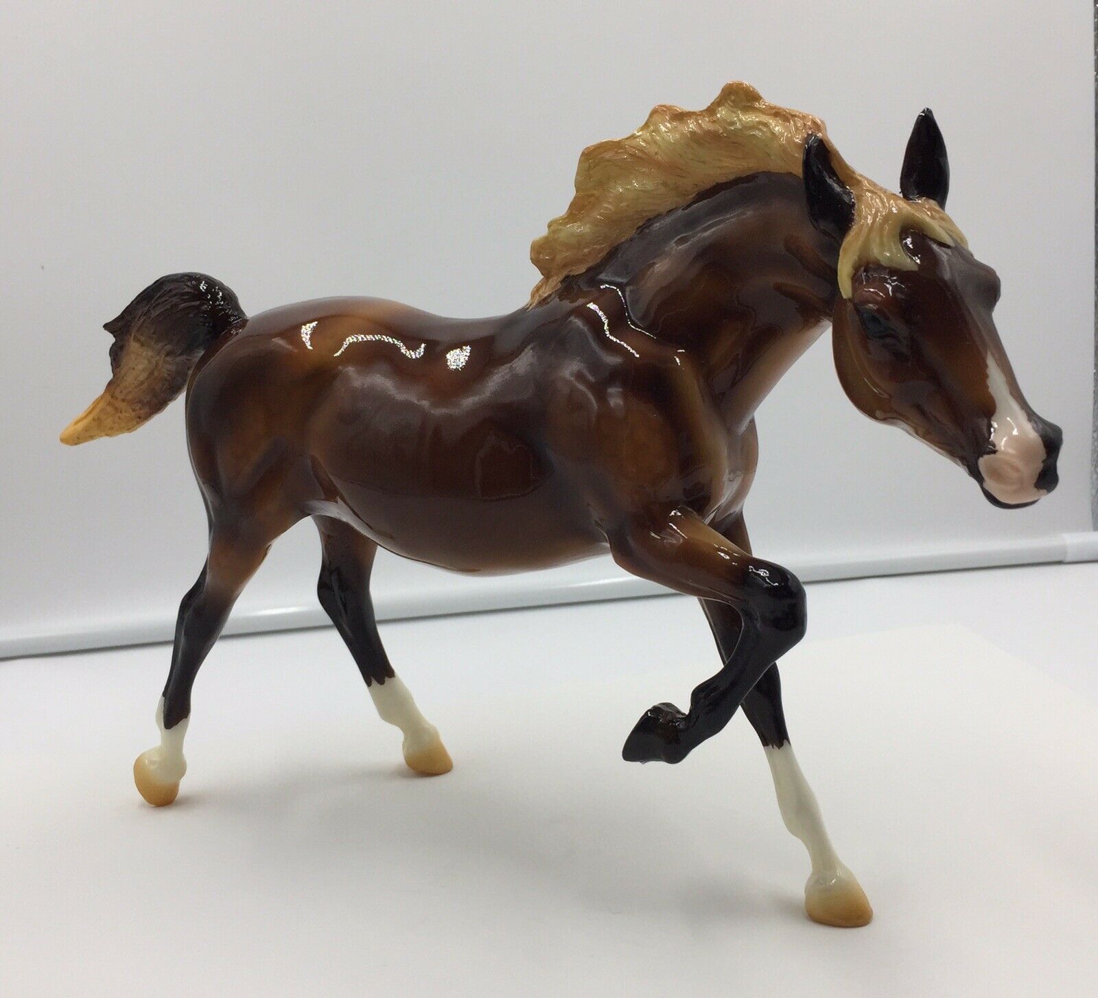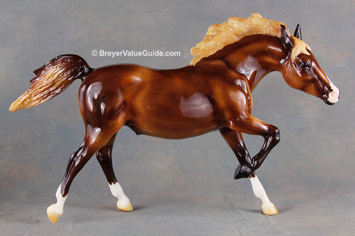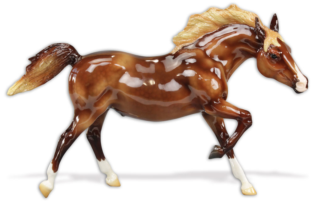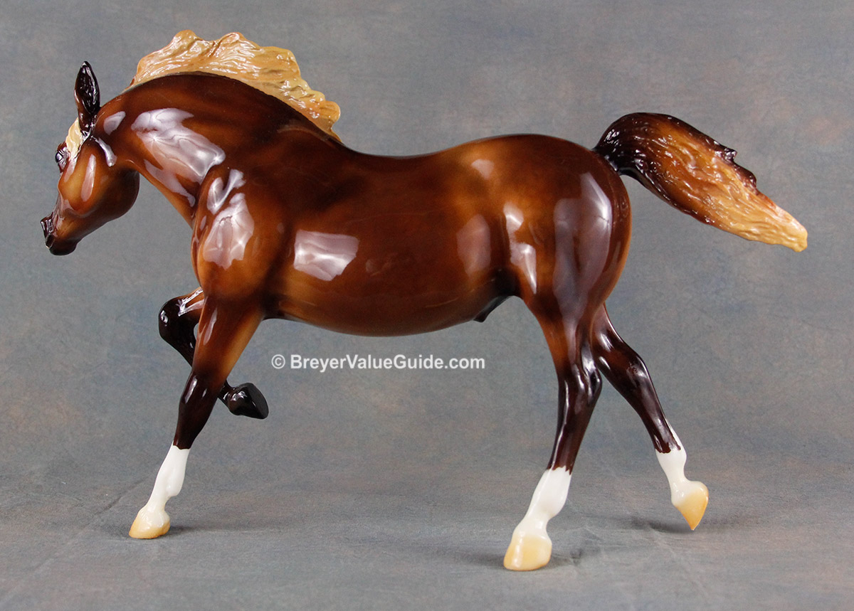 Glossy dark chestnut; dapples; flaxen mane and tail; snip; 3 socks; Live Show Benefit Raffle Model SR; 1/48