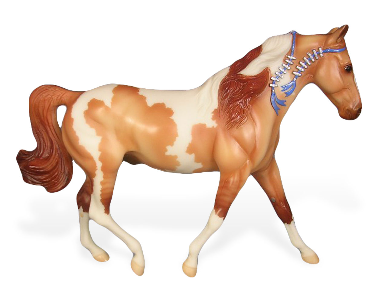 Matte chestnut pinto; leg bars; 4 stockings; blue/silver ribbons; BreyerFest Prize SR; 1/28