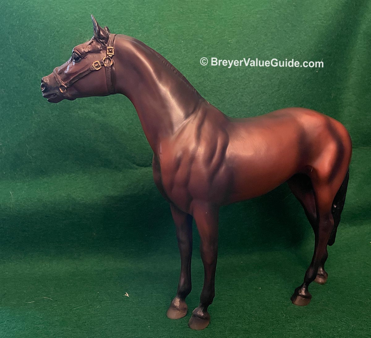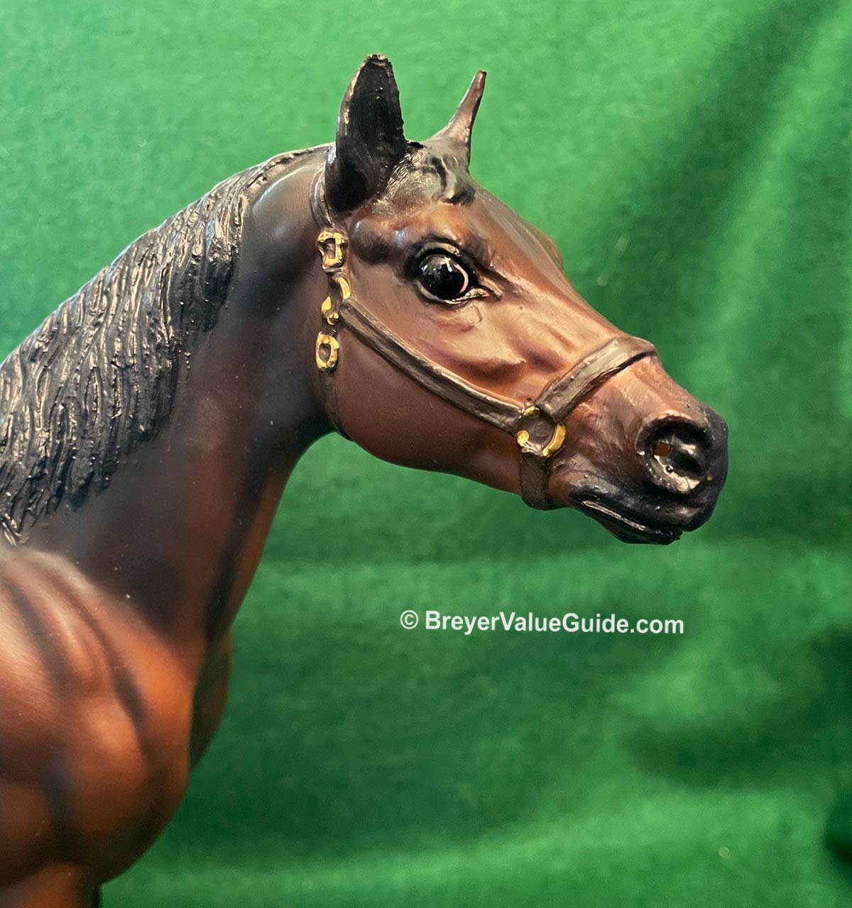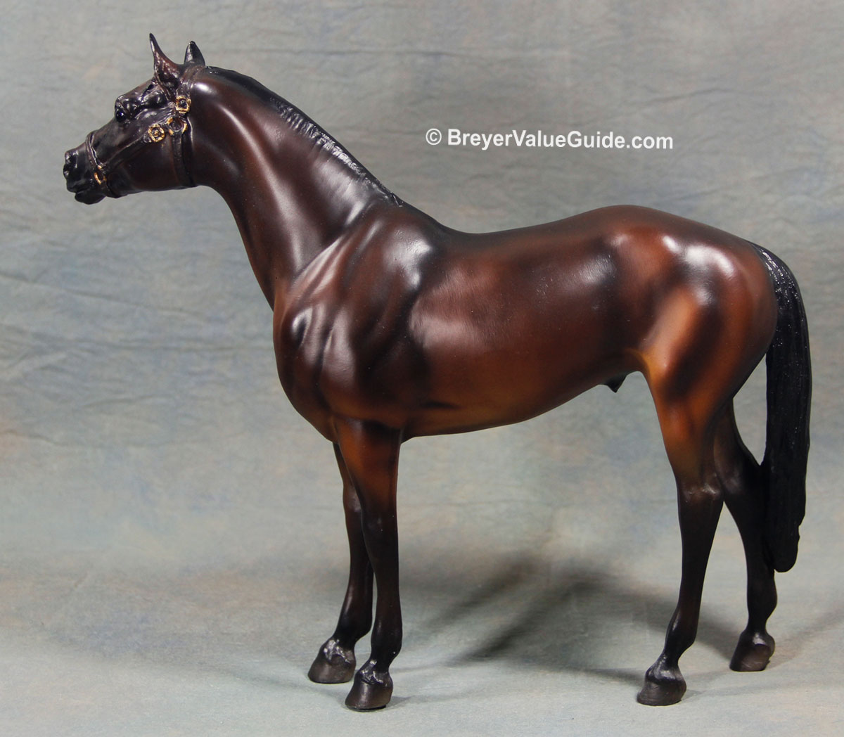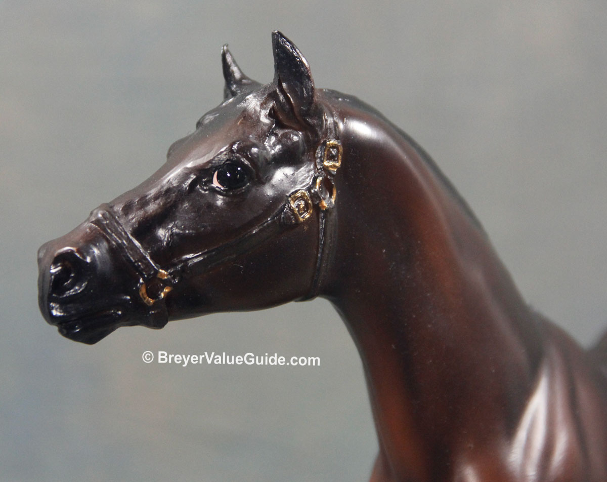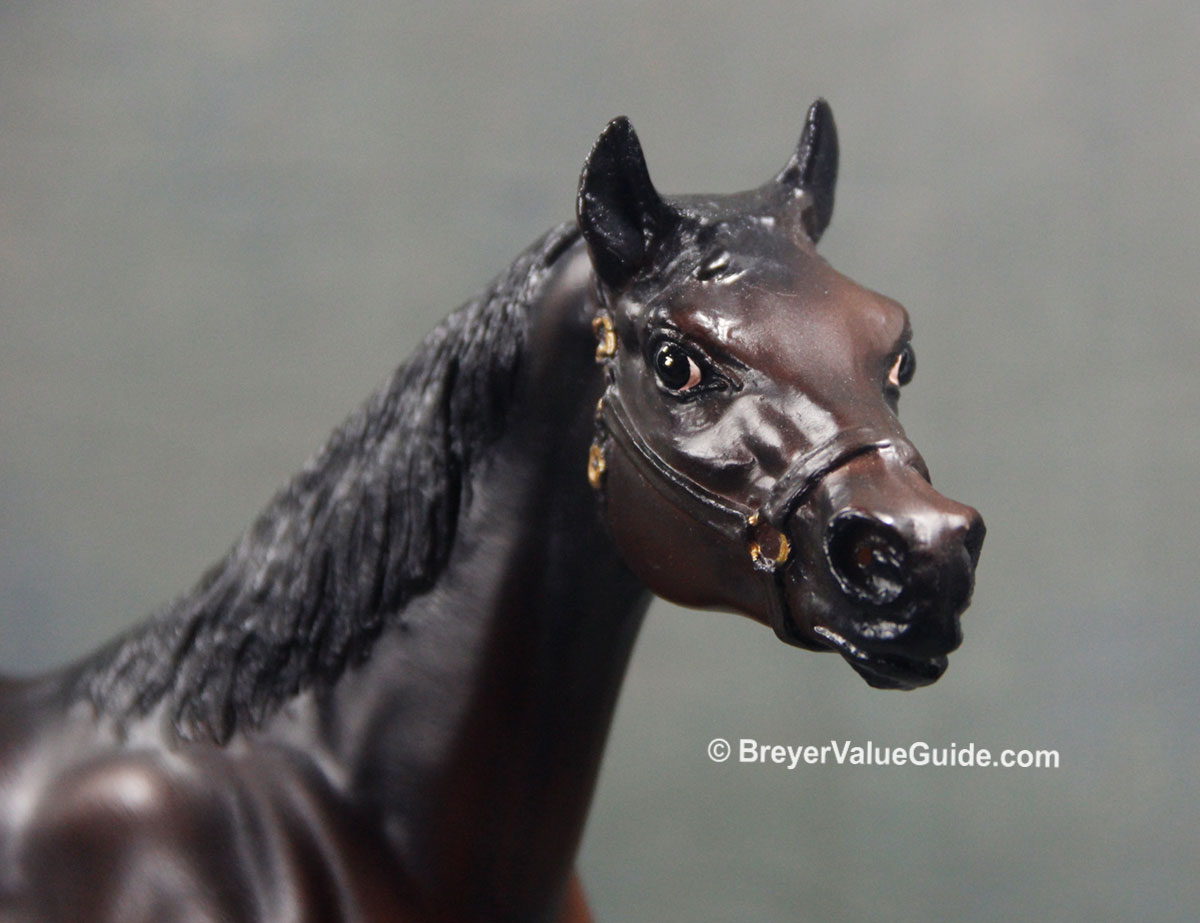 Matte shaded dark bay; black halter with gold, eye whites