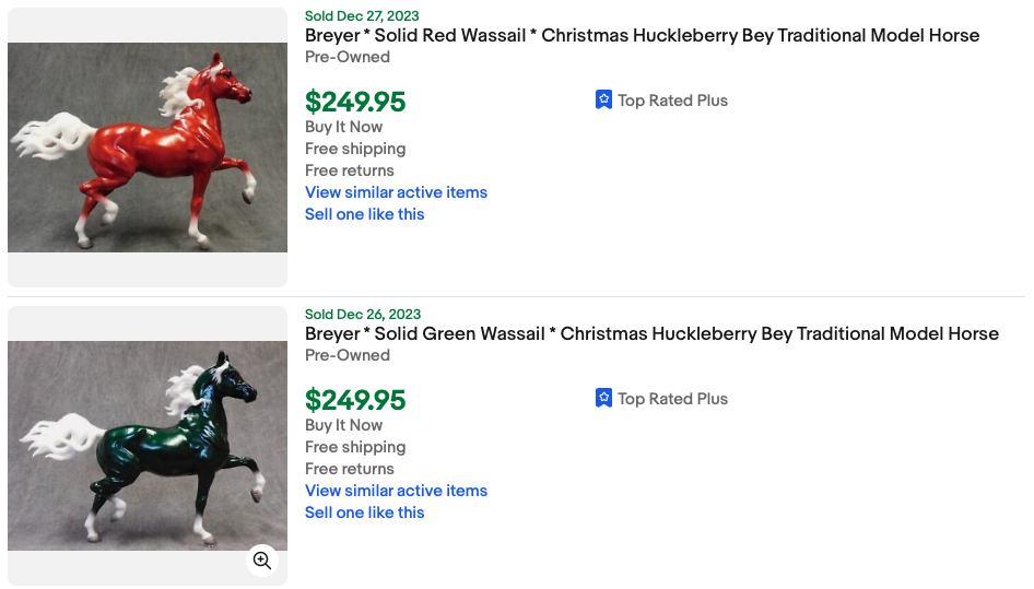 Glossy deep red with glitter, white mane and tail, 4 socks, “Wassail 2023” belly stamp, Christmas Surprise SR, 1/650 in this color Issue price $145