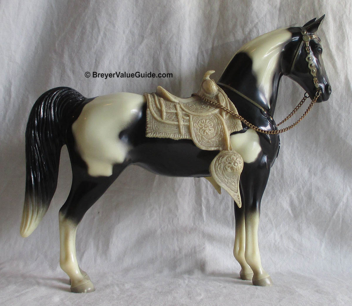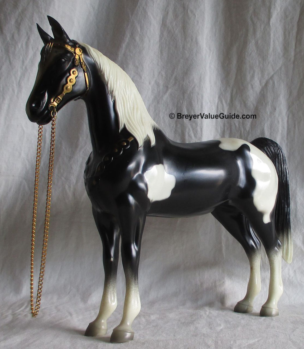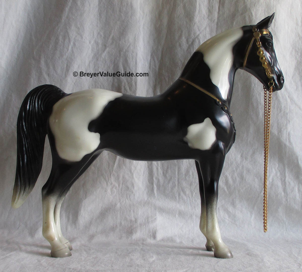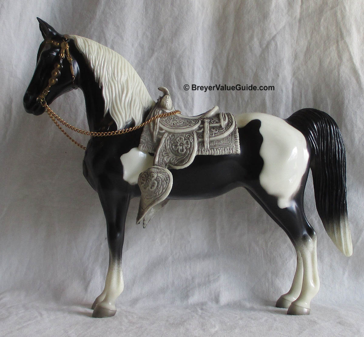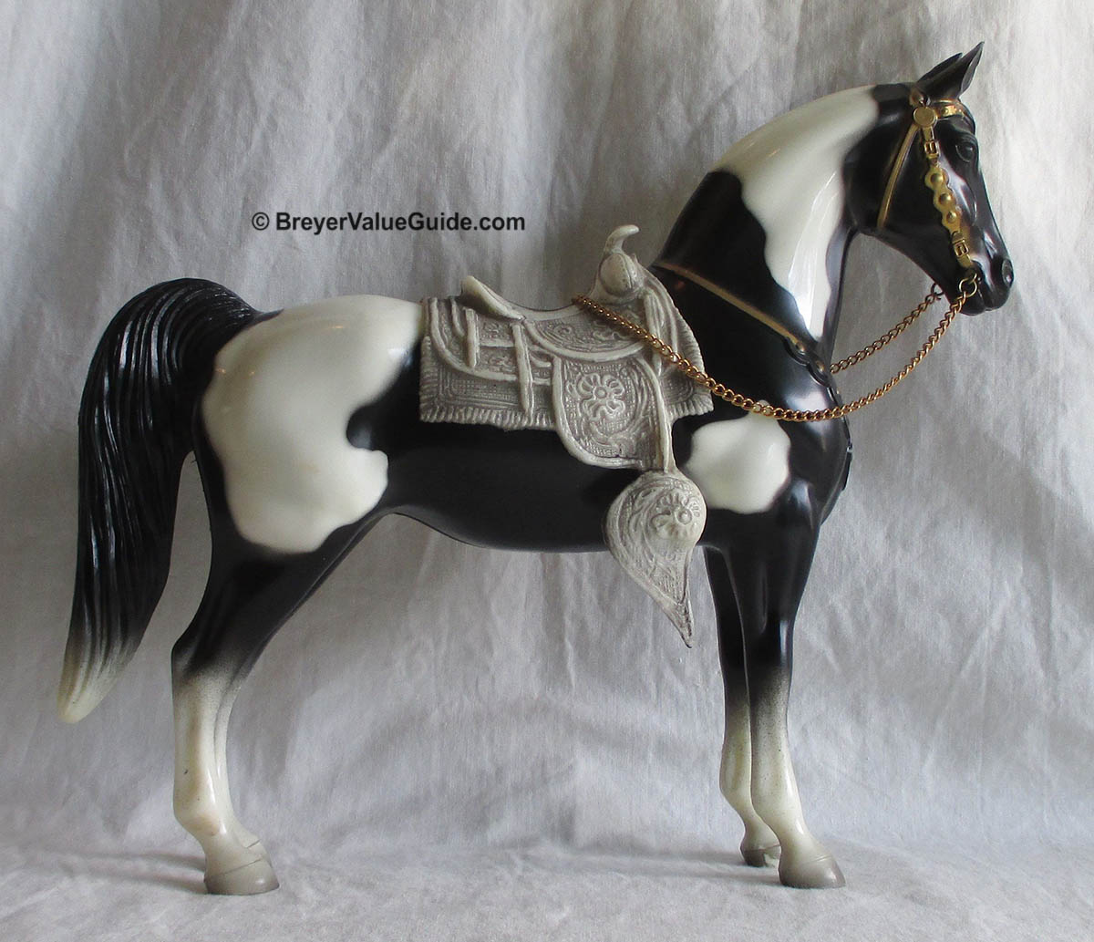 Glossy black pinto; 4 stockings; white mane; white tail tip; gold bridle; black and gold harness; black snap girth saddle or later models had grey saddle