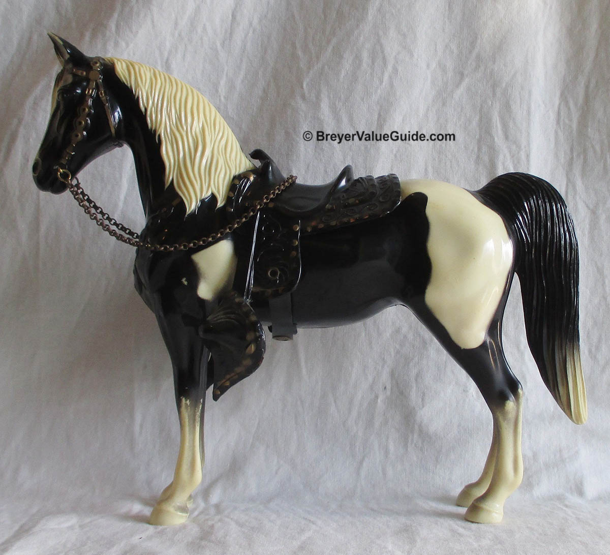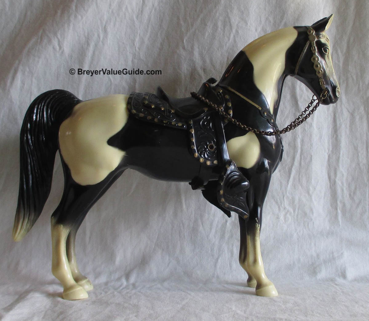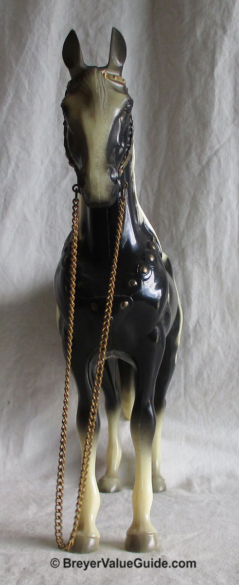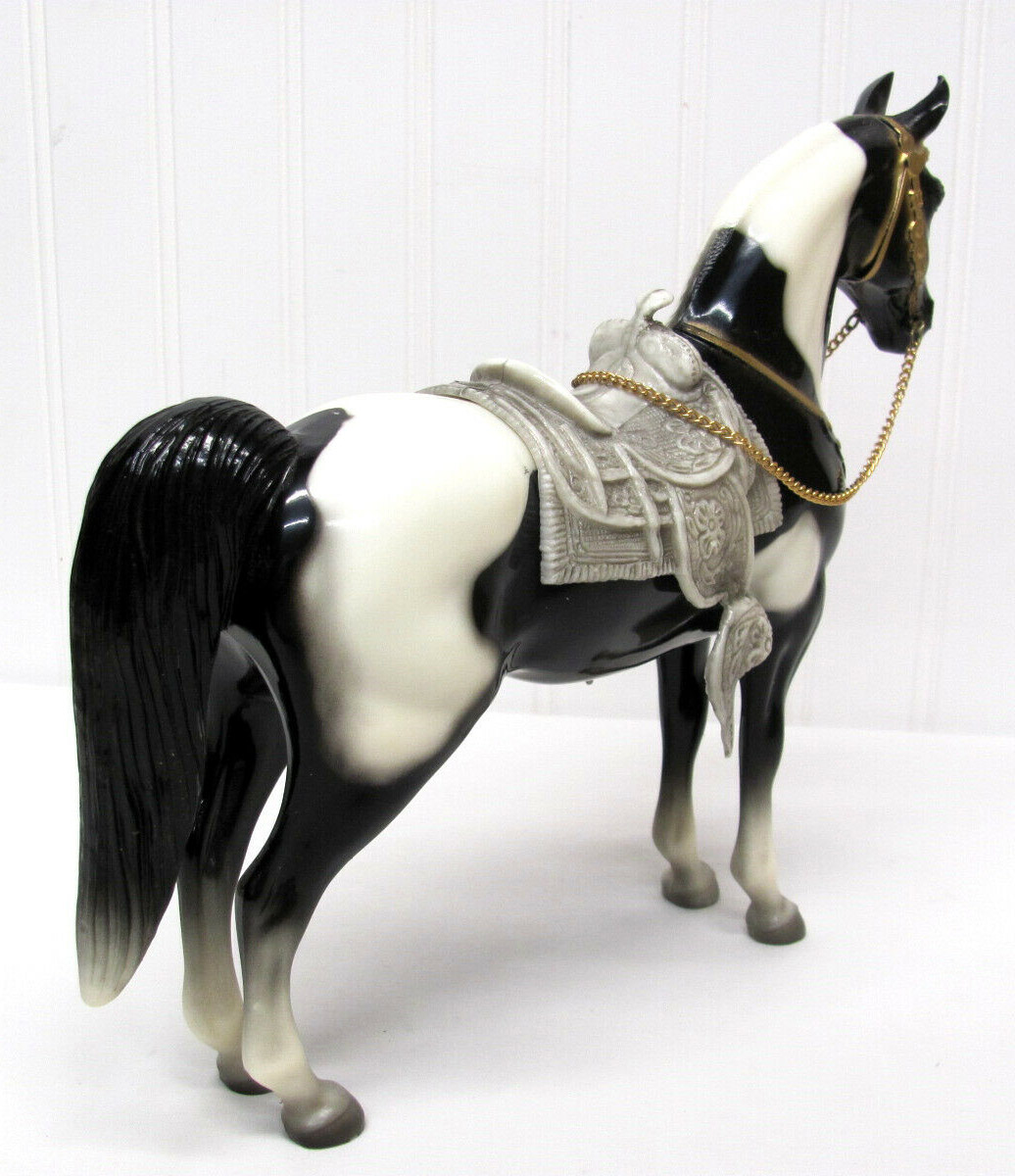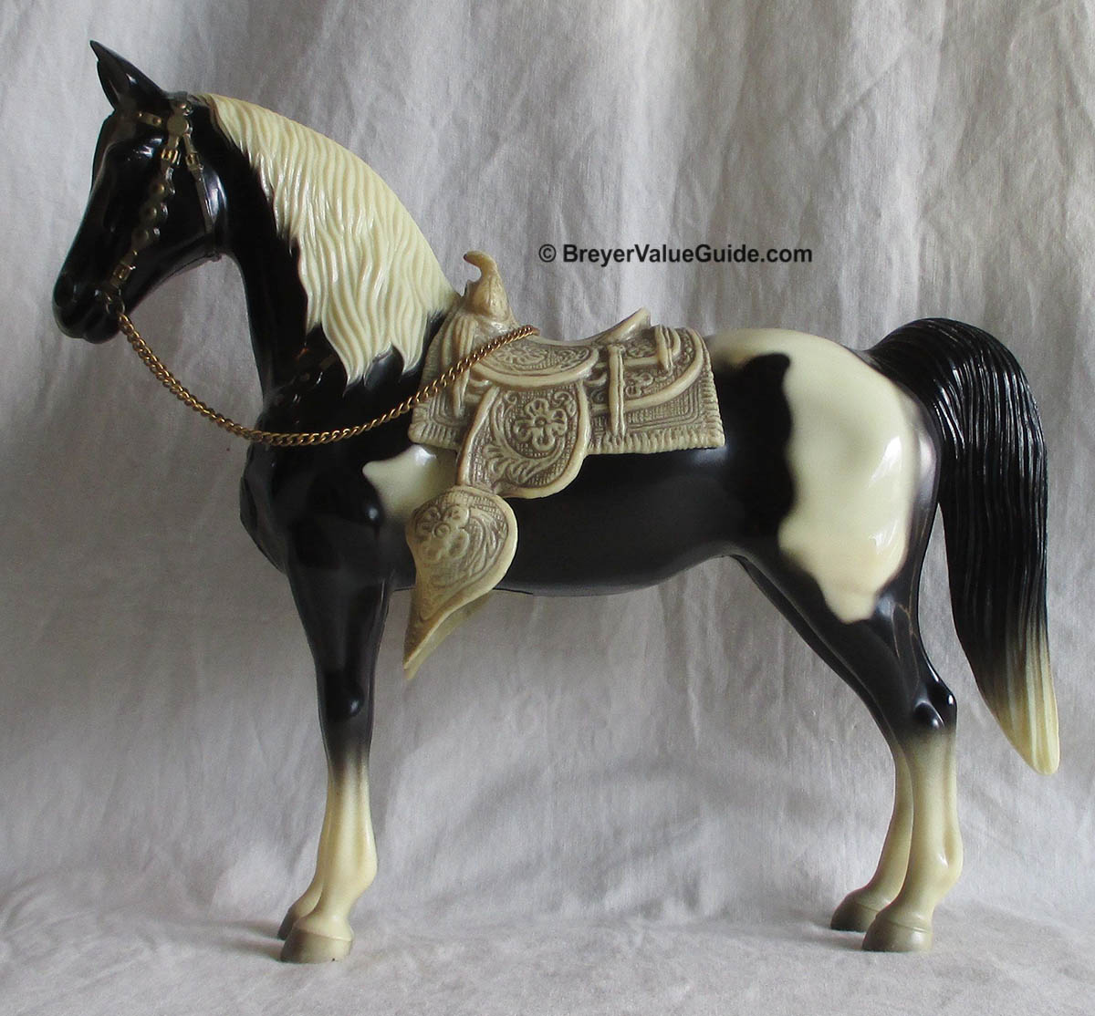 Glossy black pinto; 4 stockings; white mane; white tail tip; gold bridle; black and gold harness; black snap girth saddle or later models had grey saddle