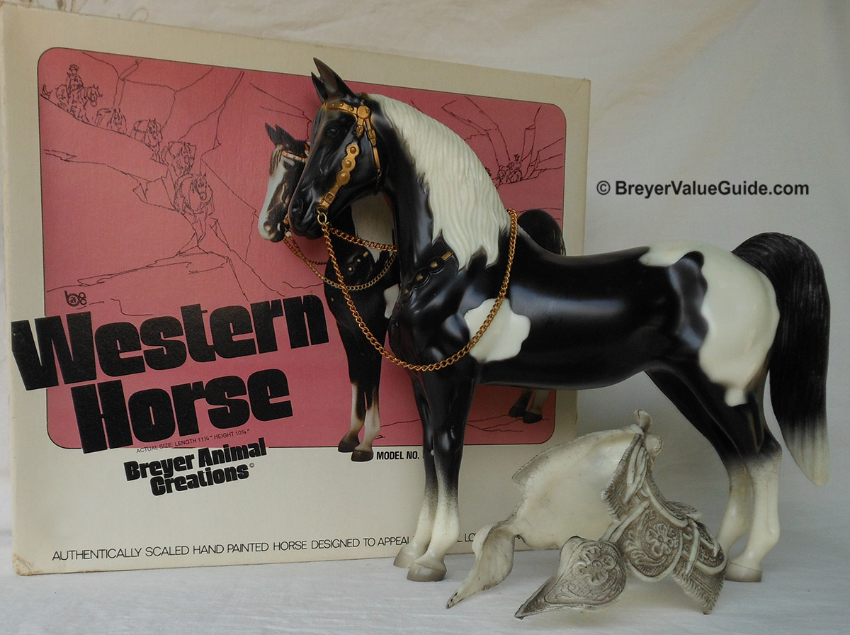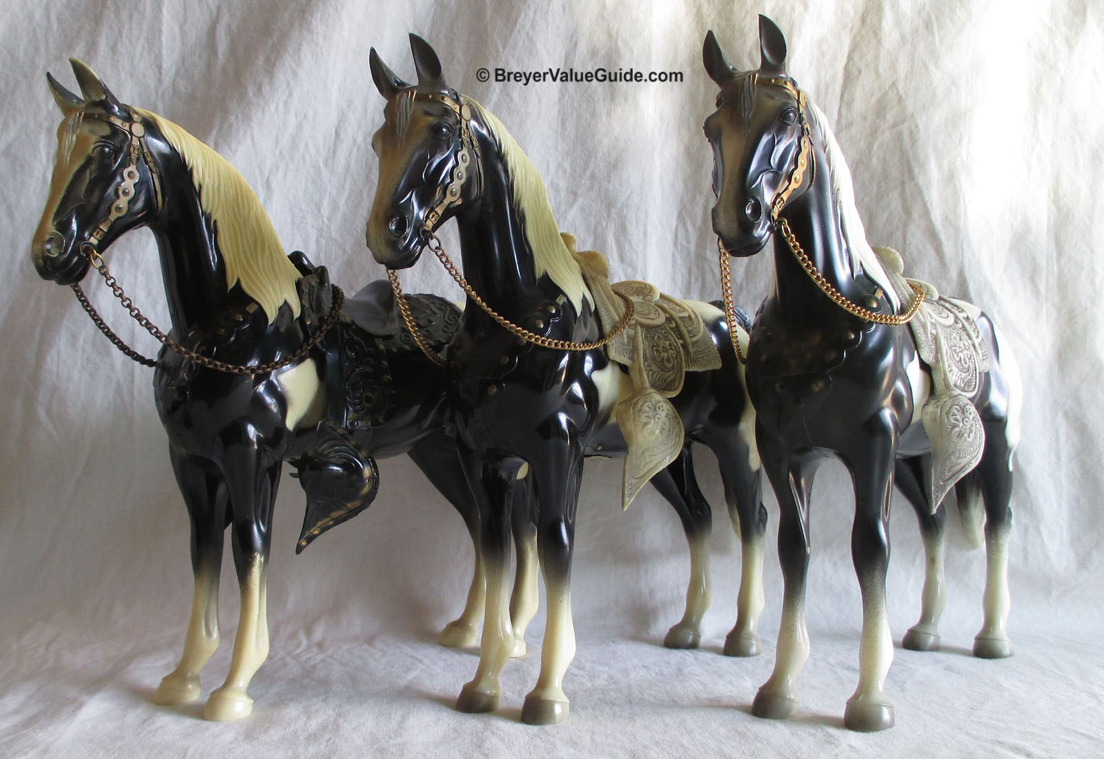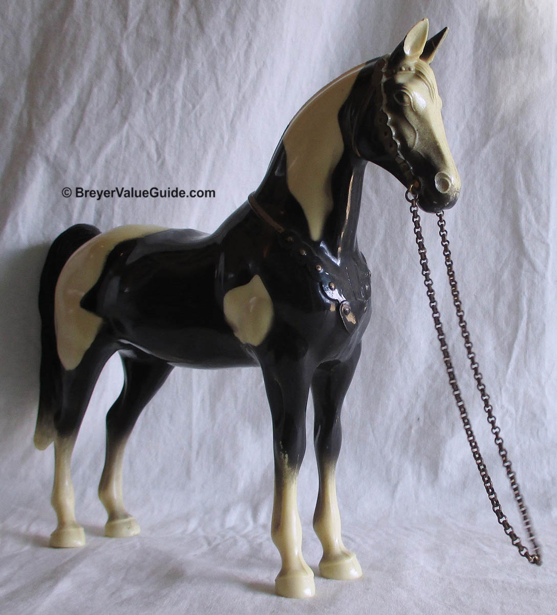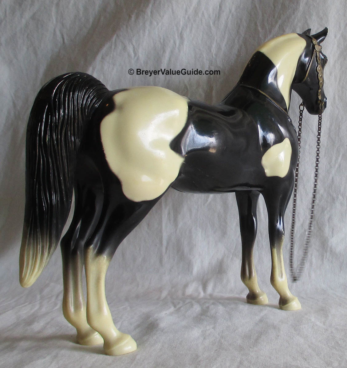 Glossy black pinto; 4 stockings; white mane; white tail tip; gold bridle; black and gold harness; black snap girth saddle or later models had grey saddle