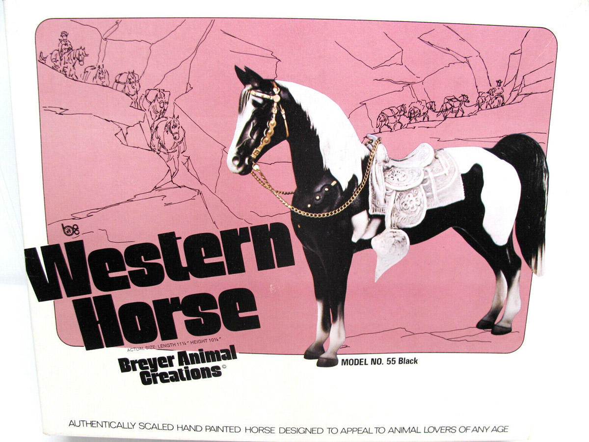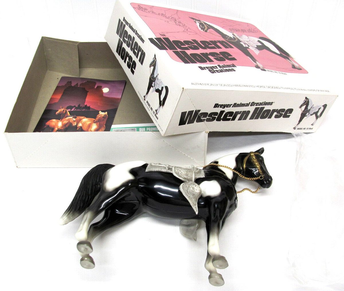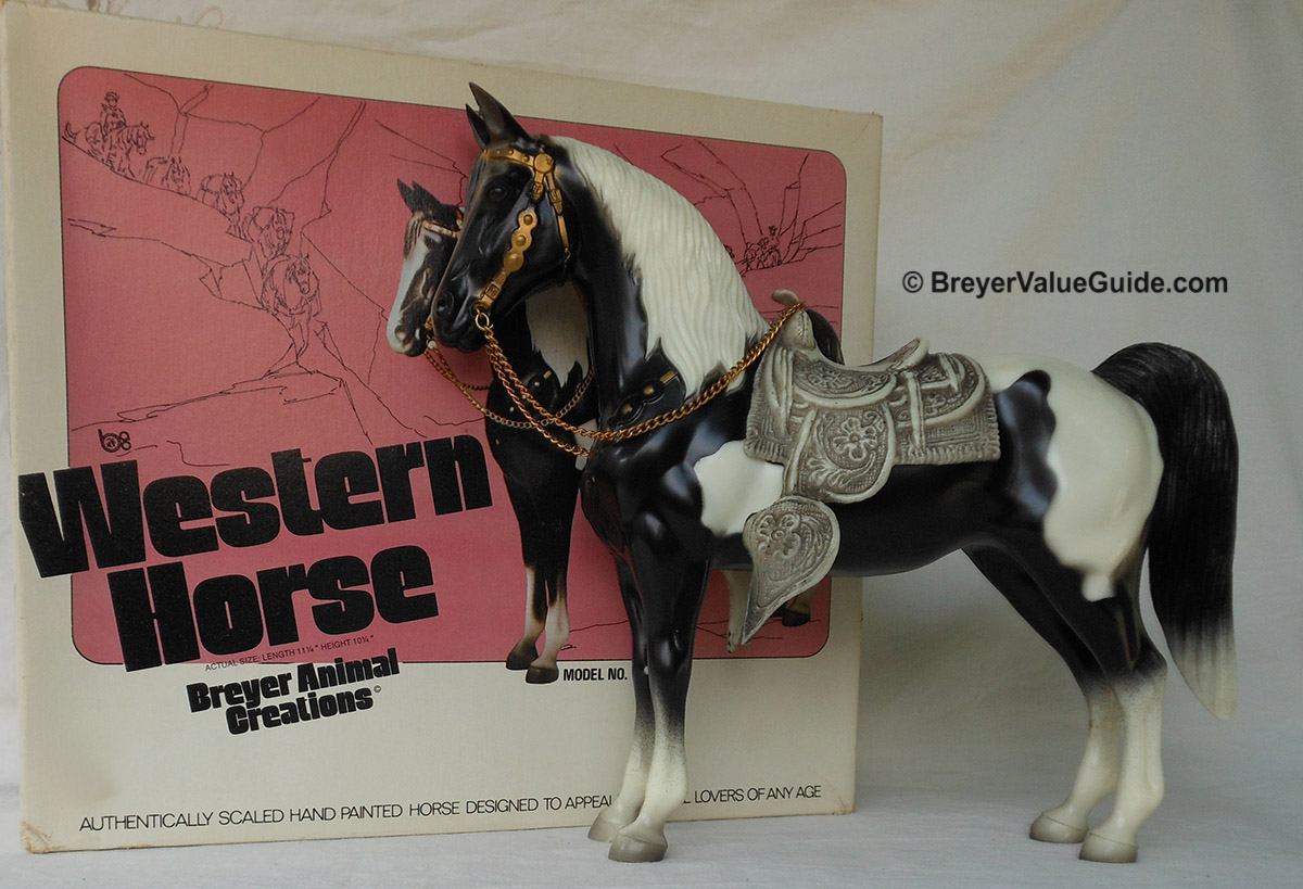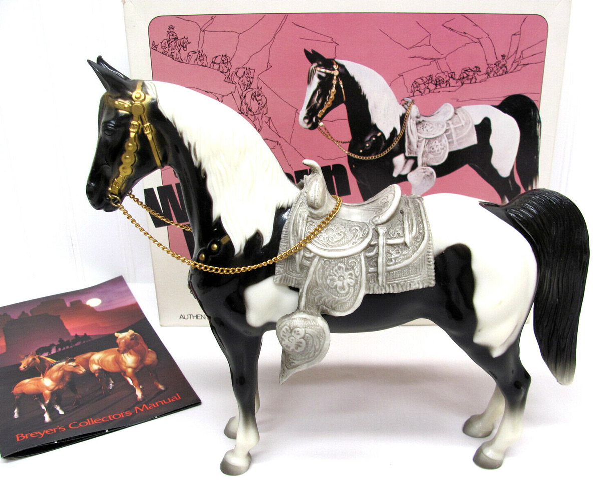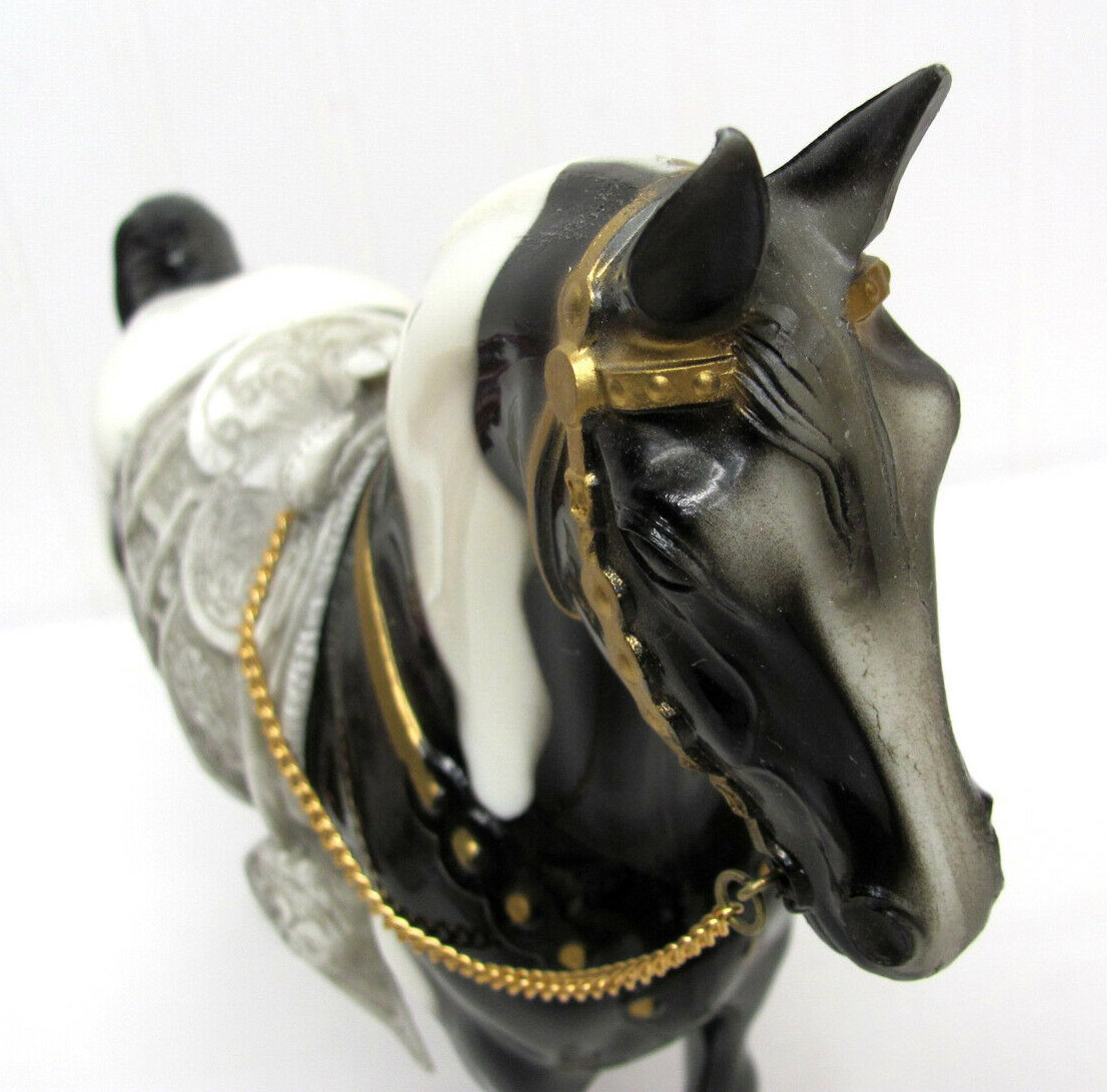 Glossy black pinto; 4 stockings; white mane; white tail tip; gold bridle; black and gold harness; black snap girth saddle or later models had grey saddle