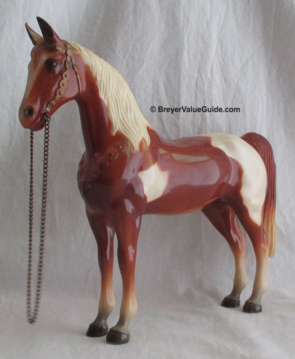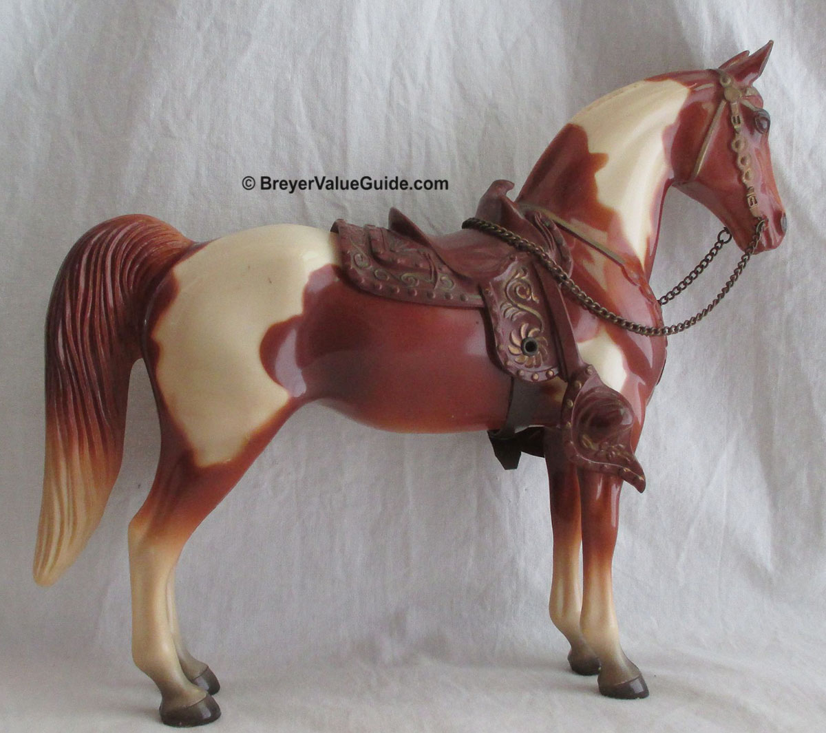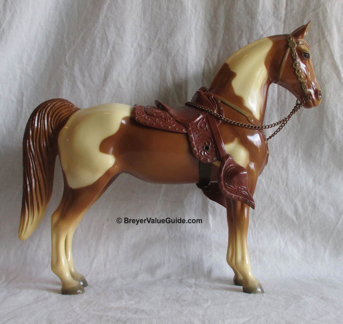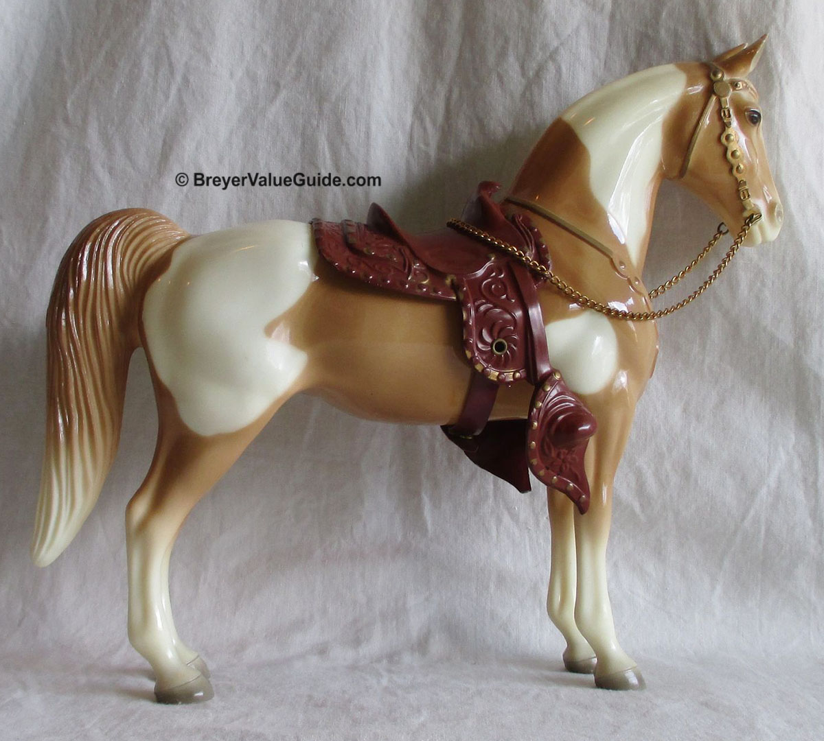 Glossy brown pinto; bald face; white mane; grey forelock; brown tail with white tip; 4 stockings; grey hooves; gold bridle; brown breastcollar with gold studs and upper straps; brown old style snap girth Western saddle; matte variations known; coloration varies from tan to deep sorrel