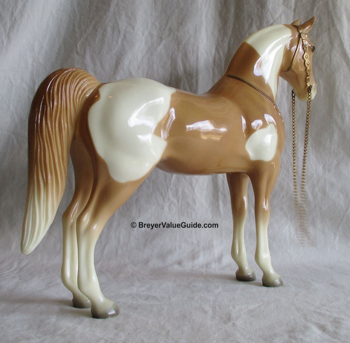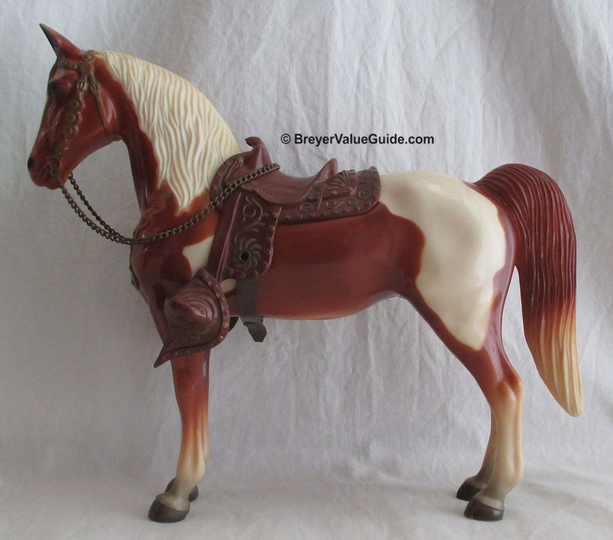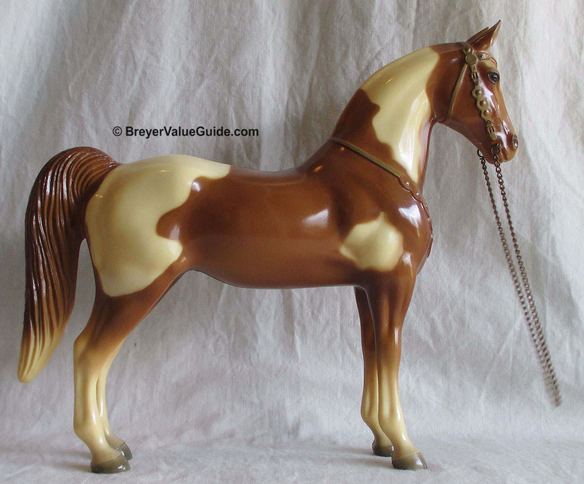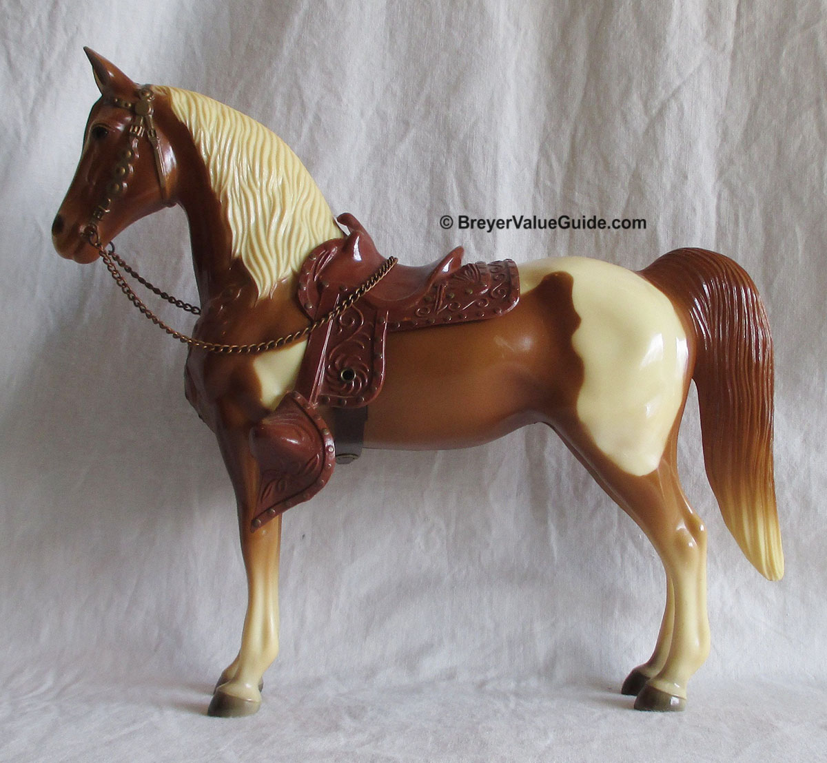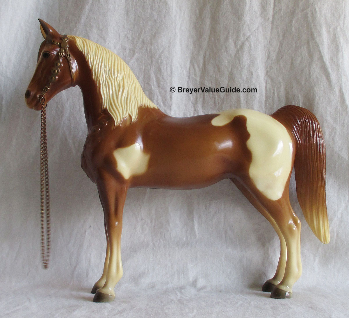 Glossy brown pinto; bald face; white mane; grey forelock; brown tail with white tip; 4 stockings; grey hooves; gold bridle; brown breastcollar with gold studs and upper straps; brown old style snap girth Western saddle; matte variations known; coloration varies from tan to deep sorrel