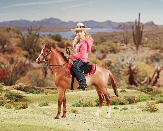 Matte red roan; blaze over muzzle; 2 hind socks; includes doll and tack