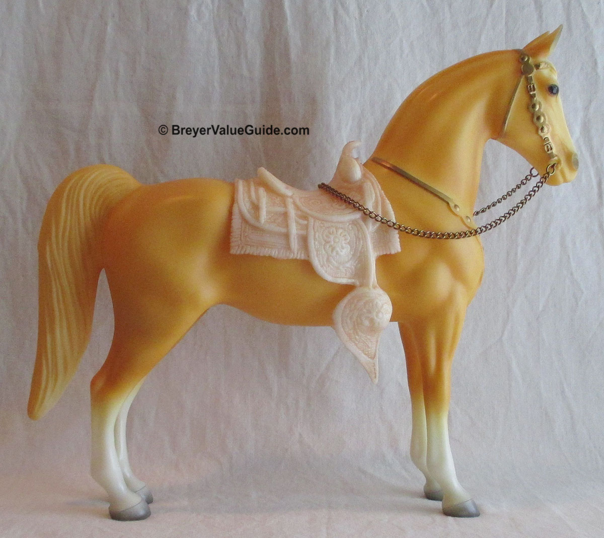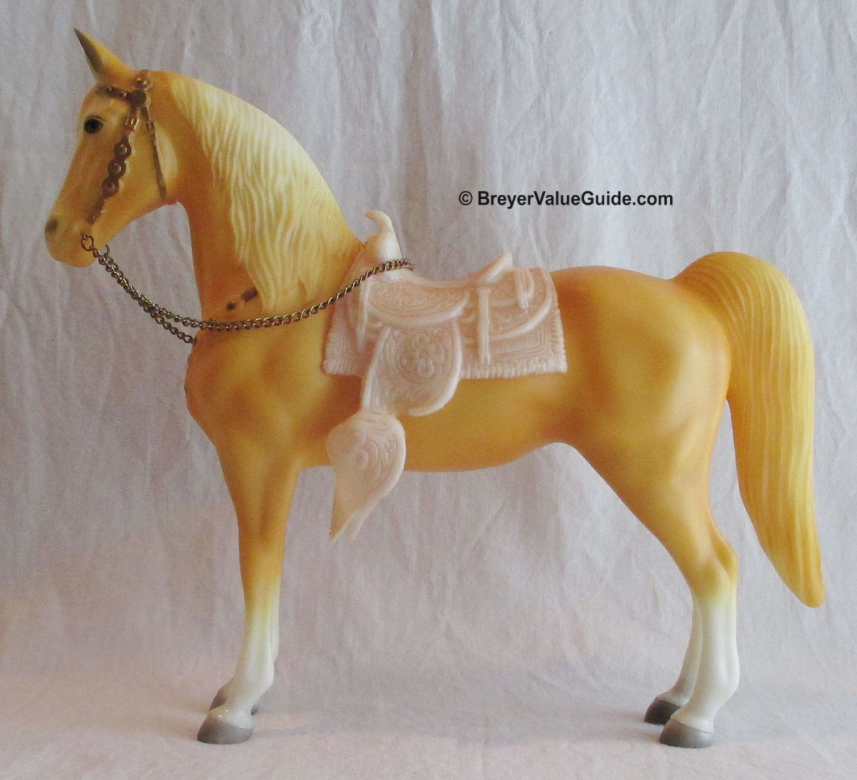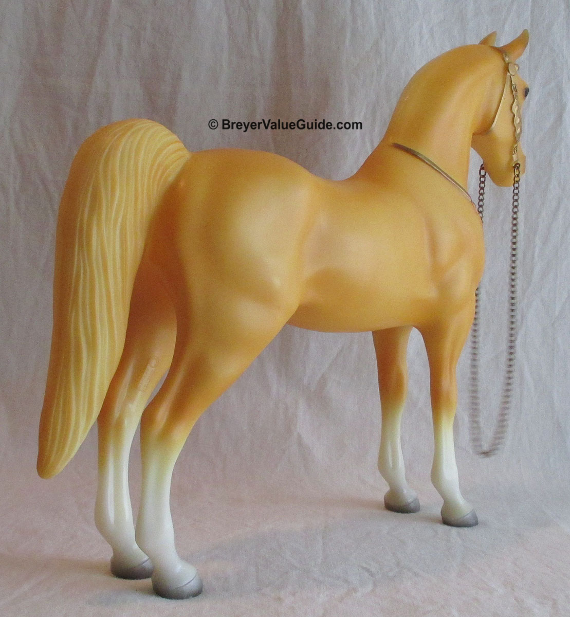 Matte palomino; light palomino mane and tail; 4 socks; grey hooves; solid gold bridle; body color breastcollar with gold studs; has “95” molded inside right hind leg; also has USA and linear mold mark; light tan saddle; QVC SR; 1/3678
