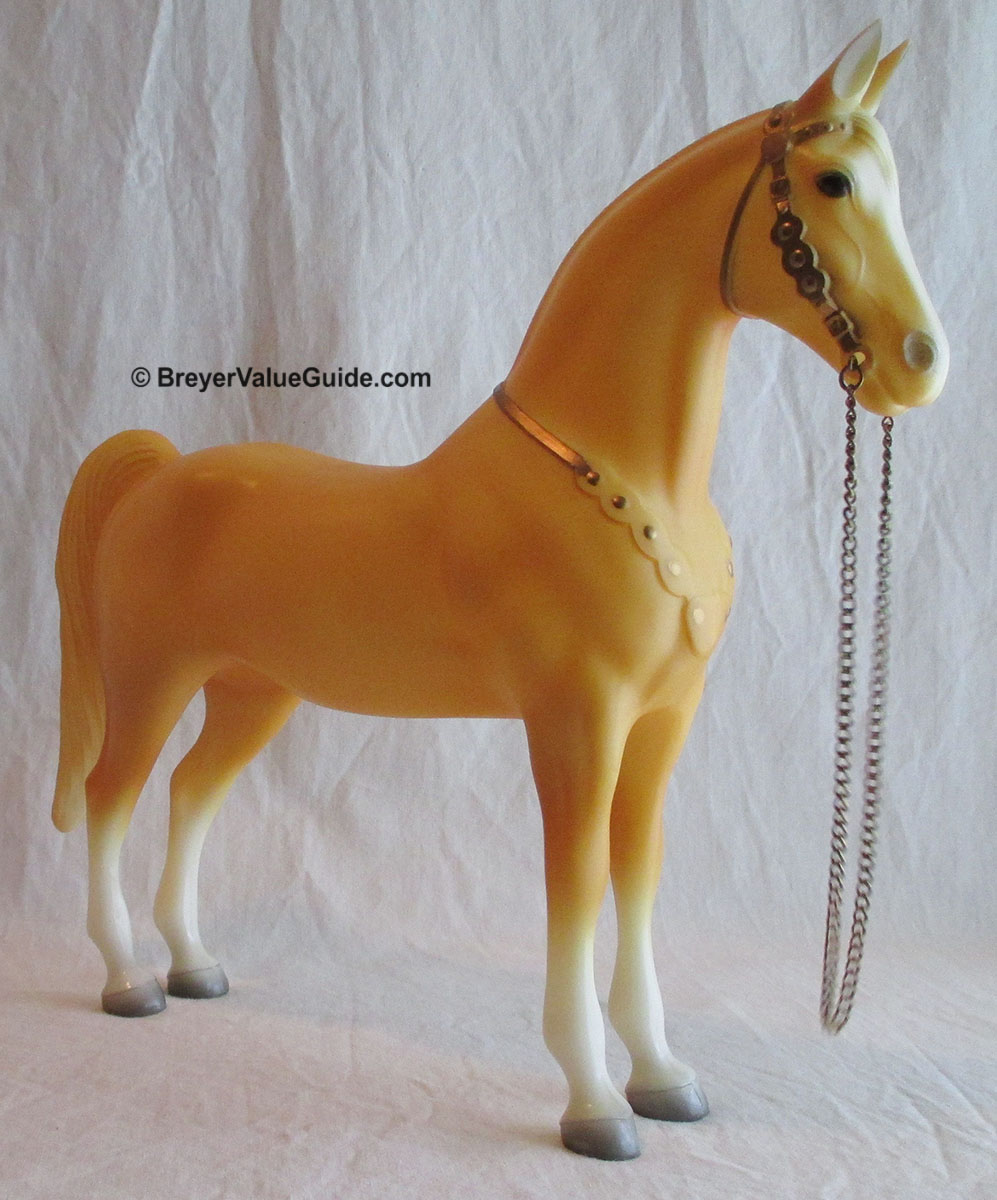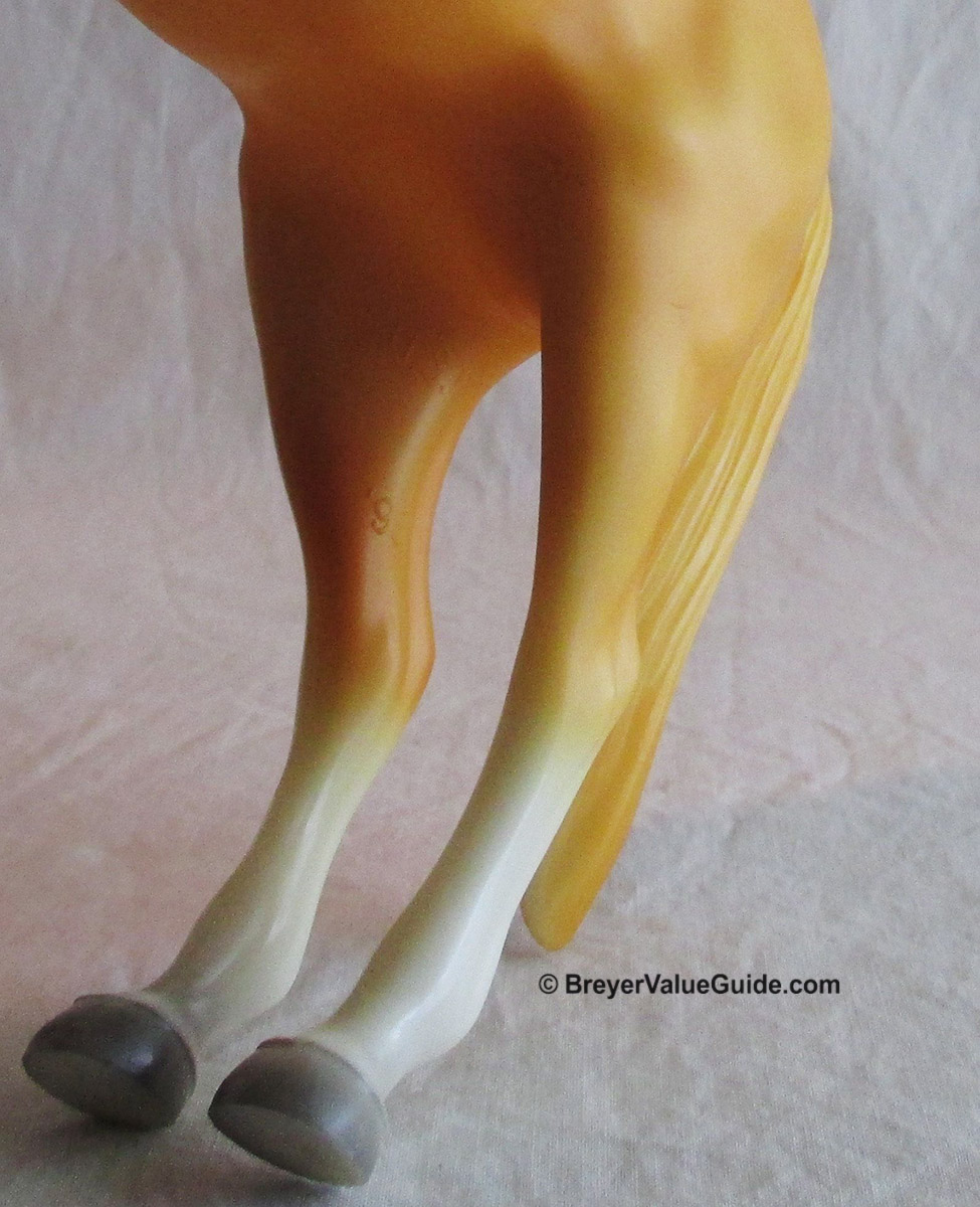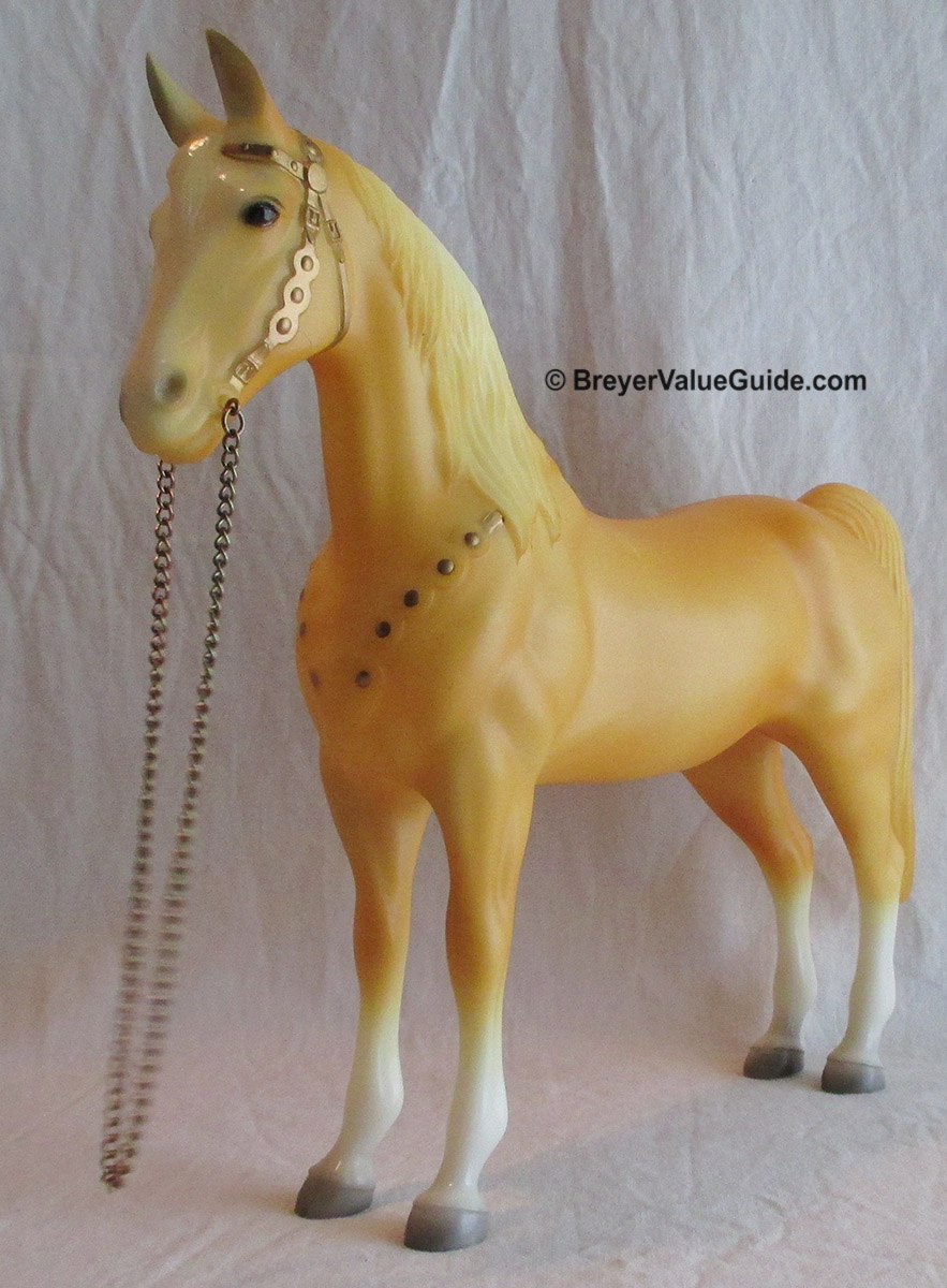 Matte palomino; light palomino mane and tail; 4 socks; grey hooves; solid gold bridle; body color breastcollar with gold studs; has “95” molded inside right hind leg; also has USA and linear mold mark; light tan saddle; QVC SR; 1/3678