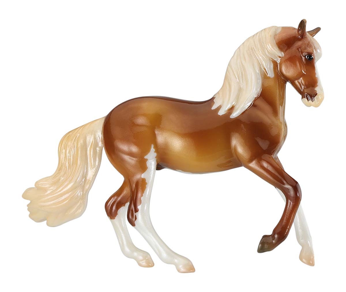 Glossy chestnut, flaxen mane and tail, blaze over muzzle, 3 stockings, BreyerFest SR, 1/1950 Issue price: $15