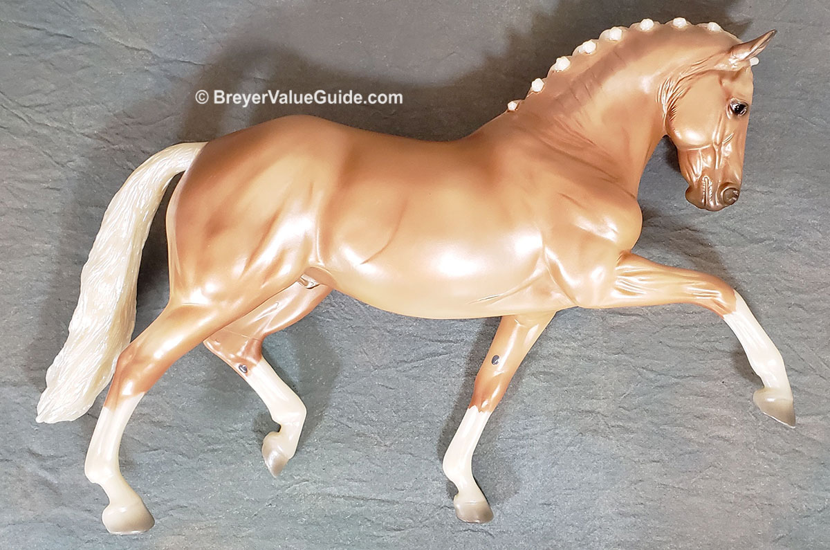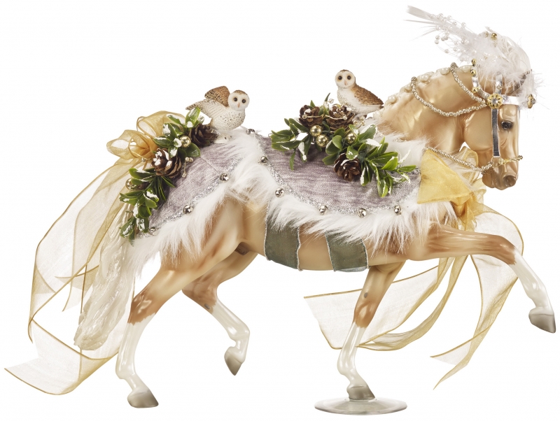 Semigloss metallic palomino; blaze; 4 white socks; grey hooves; holiday costume with owls