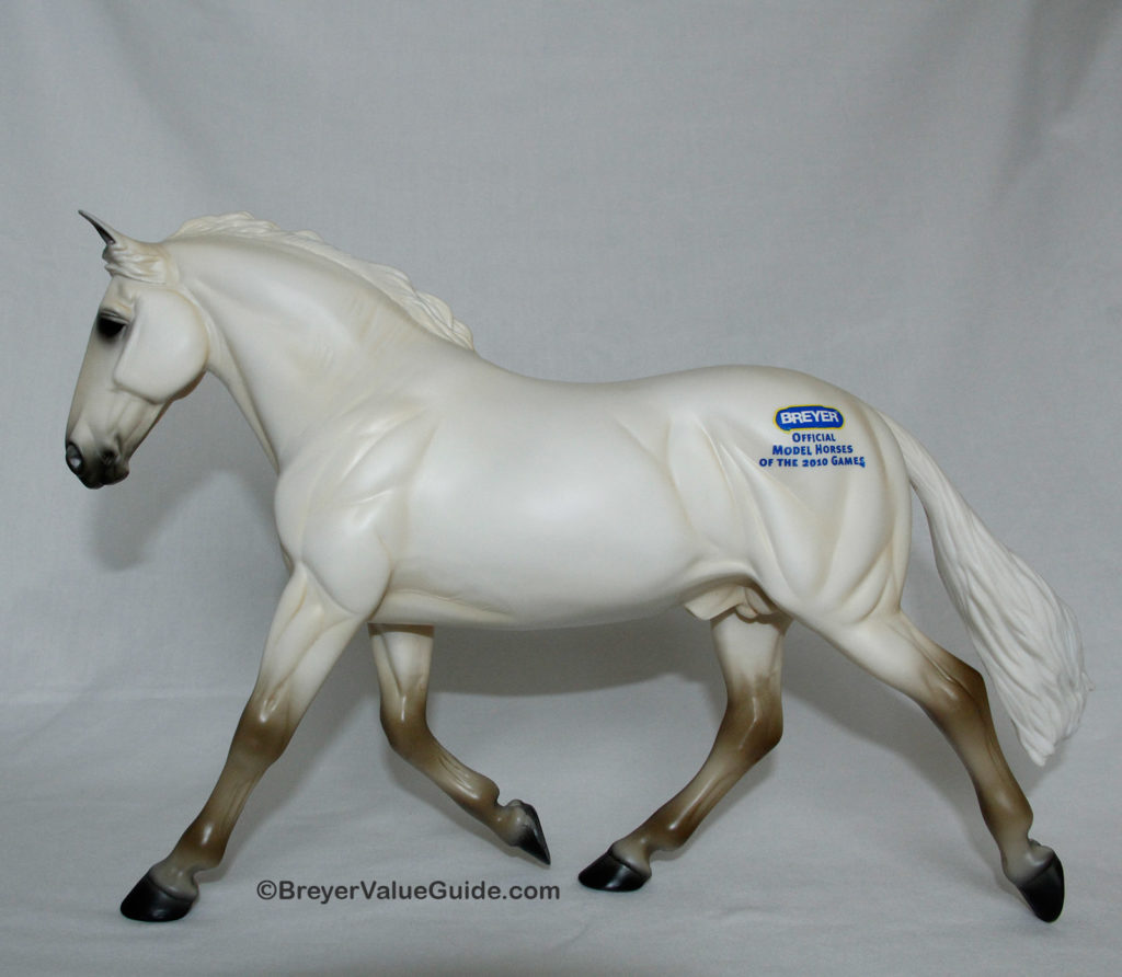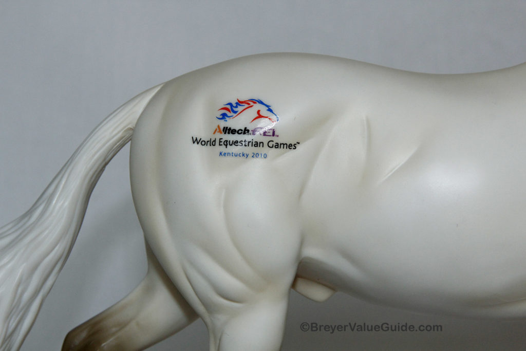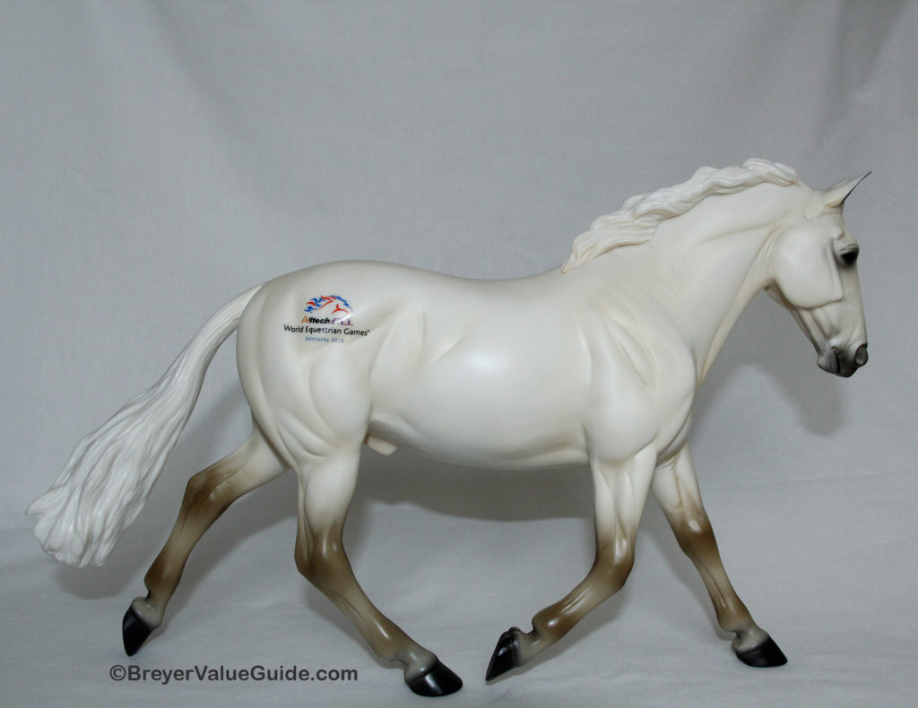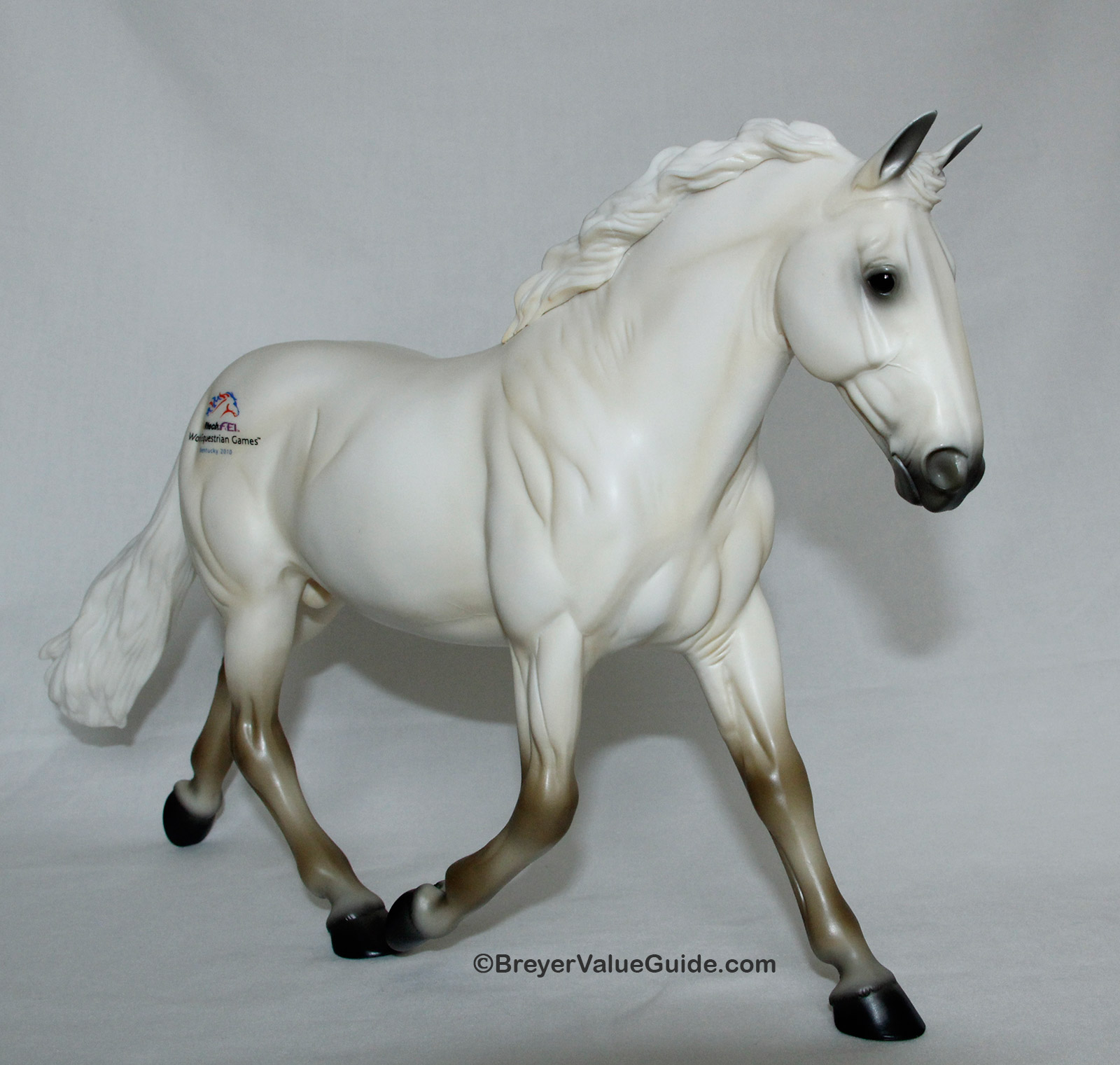 Matte white; light tan shading; dark shading on legs; black hooves; WEG and Breyer logos on hips